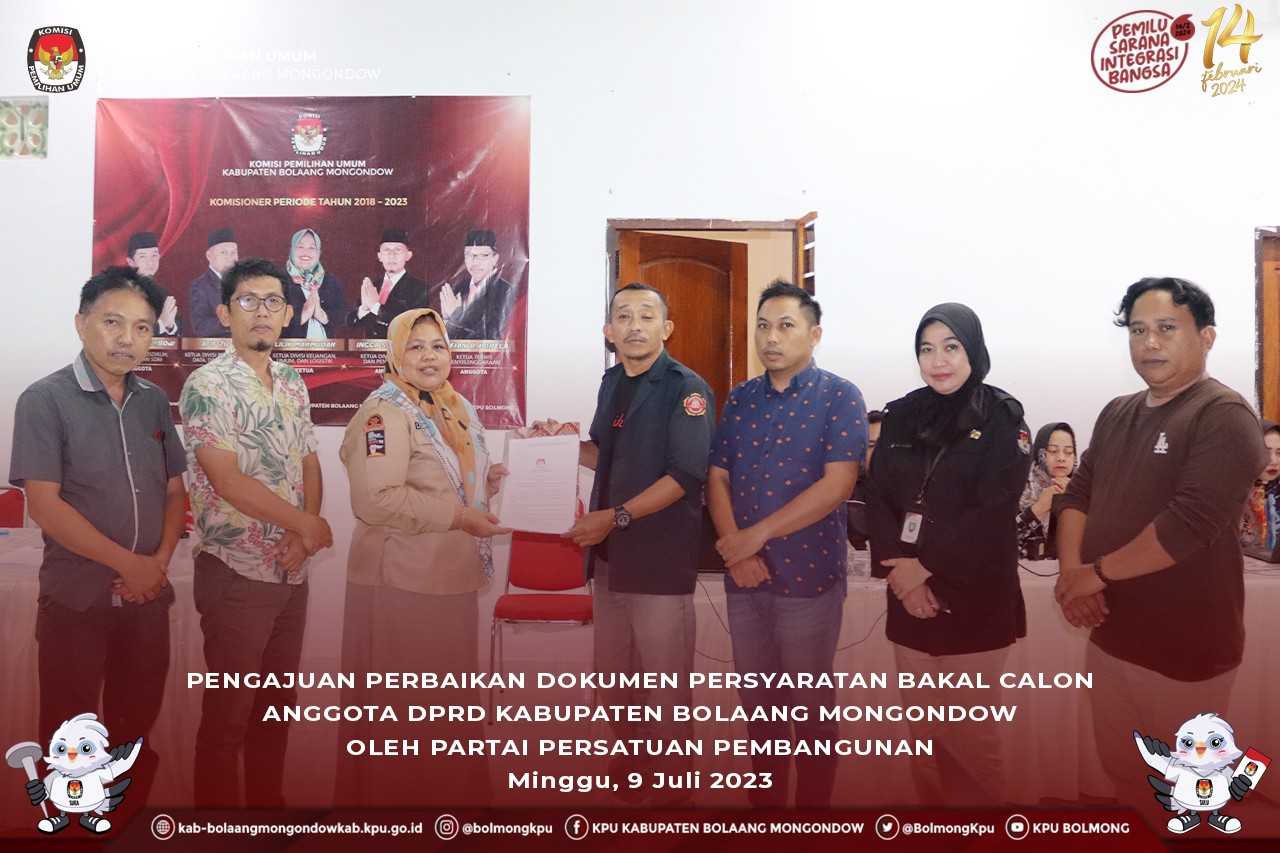 Lolak, kab-bolaangmongondow.kpu.go.id - Minggu (9/7), Partai Persatuan Pembangunan (PPP) Kabupaten Bolaang Mongondow (Bolmong) mengajukan Perbaikan Dokumen Persyaratan Bakal Calon Anggota DPRD Kabupaten pada Pemilu Tahun 2024, Minggu (9/7/2023) di Kantor KPU Bolmong.