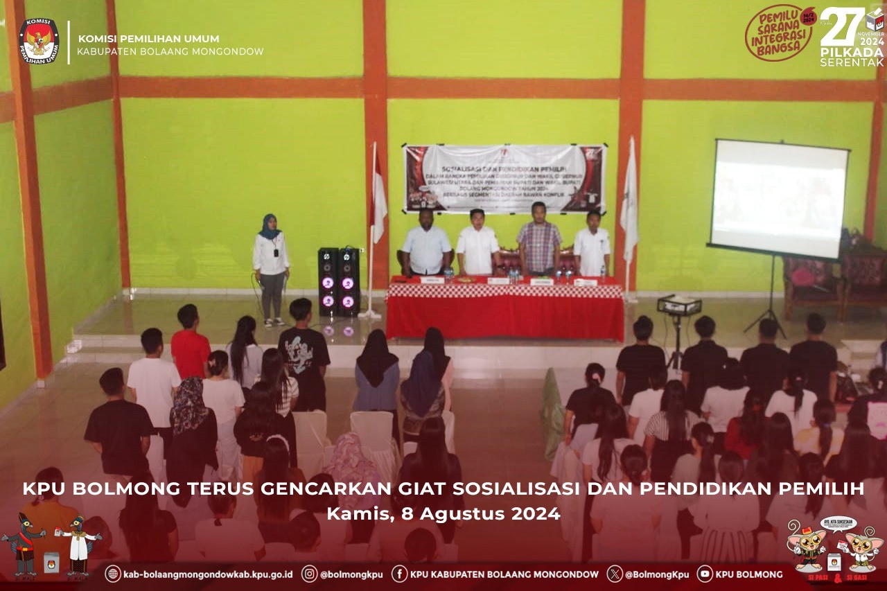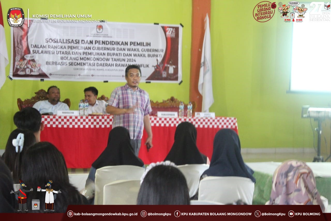 Lolak, kab-bolaangmongondow.kpu.go.id - Kamis (8/8/2024), Komisi Pemilihan Umum (KPU) Kabupaten Bolaang Mongondow kembali menggelar Sosialisasi dan Pendidikan Pemilih dalam rangka Pemilihan Gubernur dan Wakil Gubernur Sulawesi Utara, serta Bupati dan Wakil Bupati Bolaang Mongondow Tahun 2024 yang menyasar pemilih pada daerah rawan konflik, yang dilaksanakan di Desa Pusian, Kecamatan Dumoga.