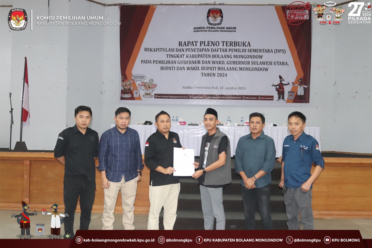 Hasil pleno ini pun ditetapkan melalui Keputusan Komisi Pemilihan Umum Kabupaten Bolaang Mongondow Nomor 993 Tahun 2024 tentang Penetapan Rekapitulasi Daftar Pemilih Sementara Kabupaten Bolaang Mongondow Provinsi Sulawesi Utara Dalam Penyelenggaraan Pemilihan Gubernur Dan Wakil Gubernur Sulawesi Utara, Serta Bupati Dan Wakil Bupati Kabupaten Bolaang Mongondow Tahun 2024. Adapun jumlah Daftar Pemilih Sementara yang ditetapkan dalam pleno ini berjumlah 183.594 Pemilih yang tersebar di 15 kecamatan.
