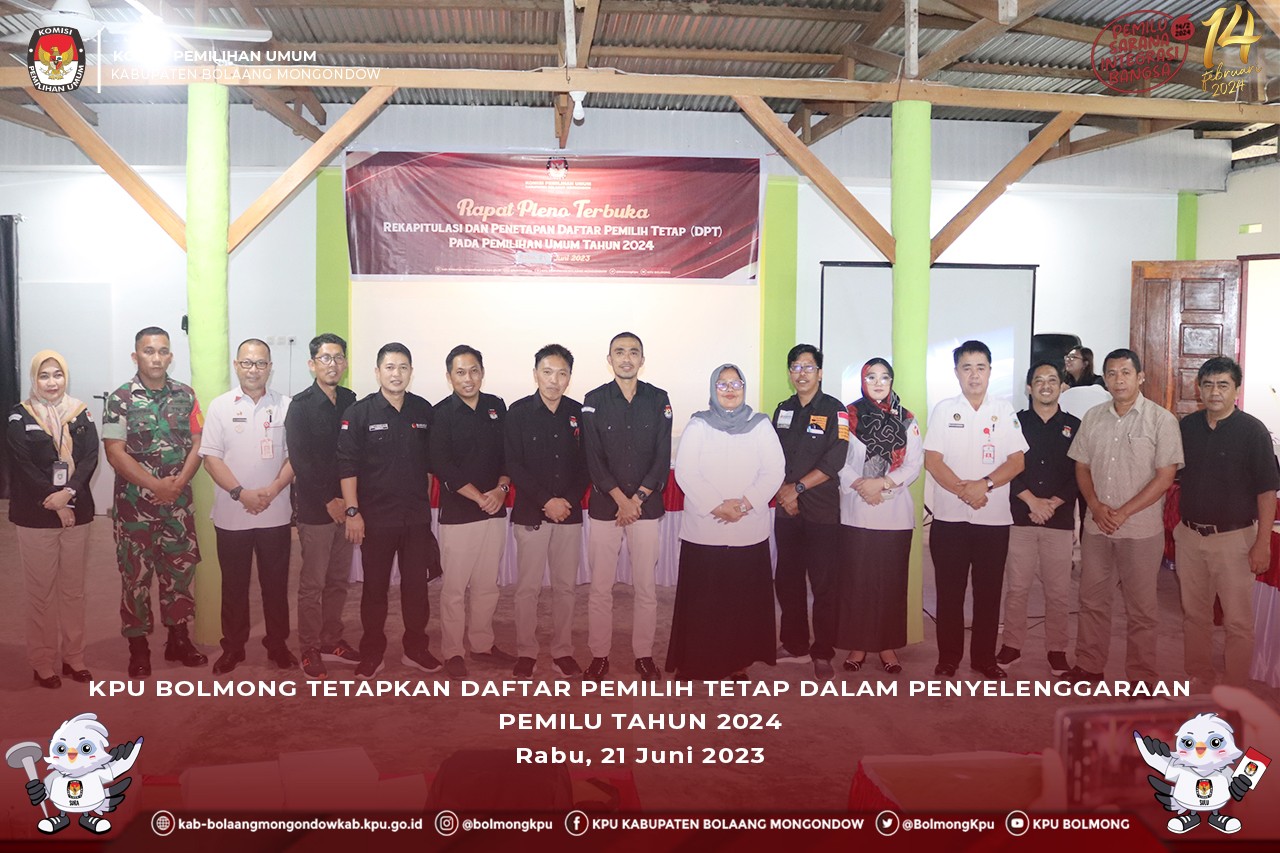 Berdasarkan hasil rapat pleno, ditetapkan Daftar Pemilih Tetap (DPT) Kabupaten Bolaang Mongondow berjumlah 182.979 pemilih, terdiri dari 94.410 pemilih laki-laki dan 88.569 pemilih perempuan yang tersebar di 15 Kecamatan/Desa dan 766 TPS. Hasil penetapan DPT ini juga langsung diserahkan kepada Bawaslu, Stakeholder, dan perwakilan partai politik yang hadir.