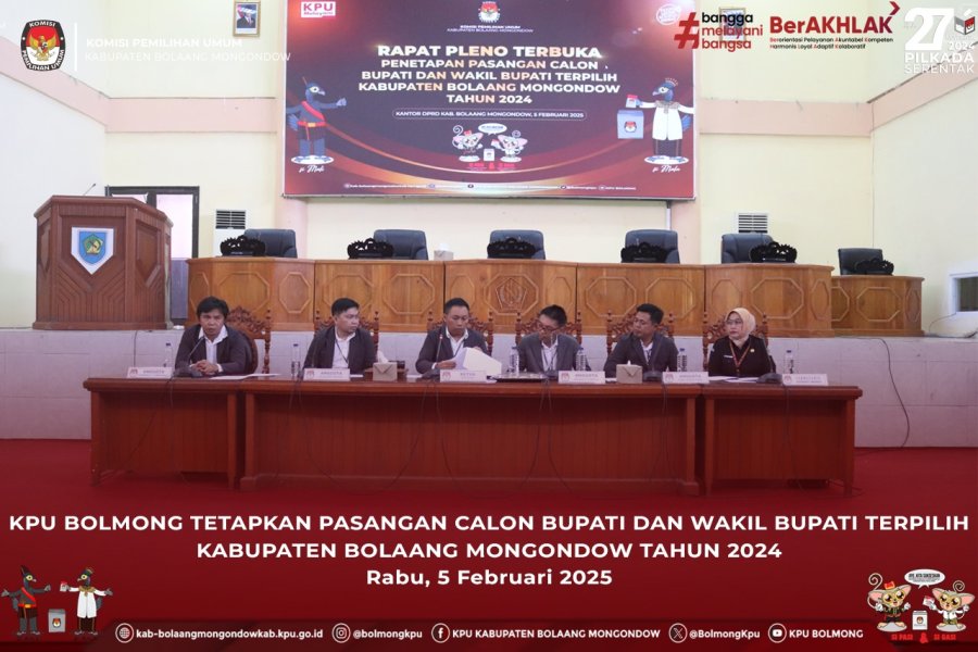 Lolak, kab-bolaangmongondow.kpu.go.id - Komisi Pemilihan Umum (KPU) Kabupaten Bolaang Mongondow (Bolmong) menggelar Rapat Pleno Terbuka Penetapan Pasangan Calon Bupati dan Wakil Bupati Terpilih Kabupaten Bolaang Mongondow. Kegiatan berlangsung di Ruang Rapat Paripurna DPRD Bolmong, Rabu (5/2/2025).