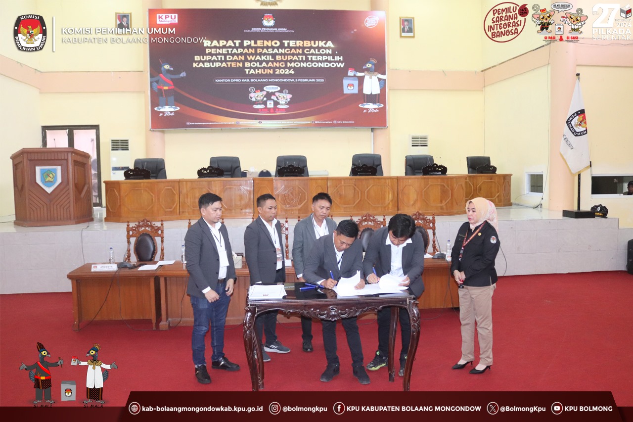 Rapat pleno tersebut diawali dengan pembacaan tata tertib, dilanjutkan pembacaan dan penandatanganan berita acara penetapan, serta pembacaan Keputusan Komisi Pemilihan Umum Kabupaten Bolaang Mongondow Nomor 14 Tahun 2025 tentang Penetapan Pasangan Calon Bupati dan Wakil Bupati Terpilih Kabupaten Bolaang Mongondow Tahun 2024.