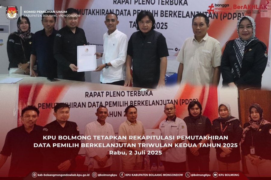 Hasil pleno ini dituangkan dalam Keputusan Komisi Pemilihan Umum Kabupaten Bolaang Mongondow Nomor 19 Tahun 2025 tentang Penetapan Rekapitulasi Pemutakhiran Data Pemilih Berkelanjutan Kabupaten Bolaang Mongondow Triwulan Kedua Tahun 2025 yang dapat diunduh pada link {klik di sini}