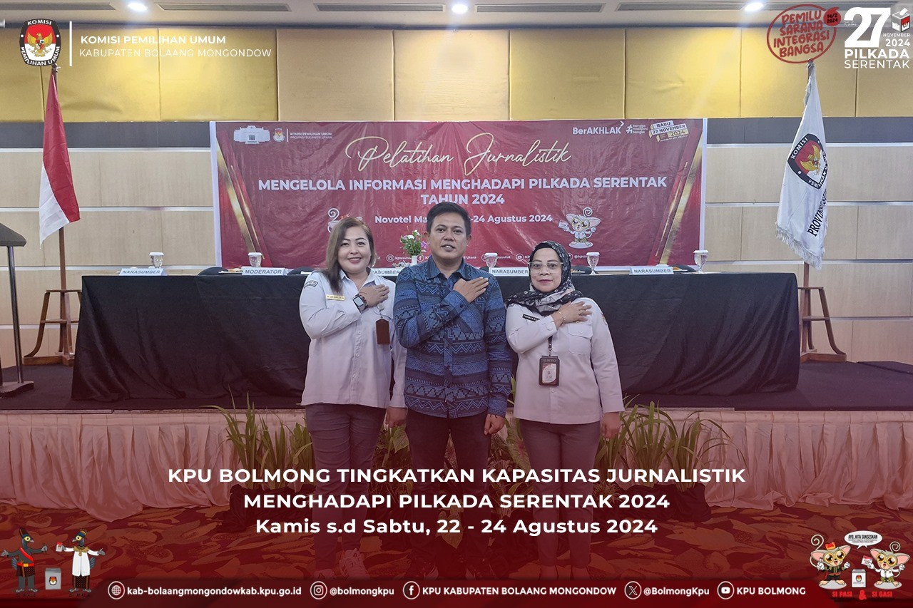 Lolak, kab-bolaangmongondow.kpu.go.id - Selang 3 hari, 22-23 Agustus 2024, Komisioner dan Staf Sekretariat Komisi Pemilihan Umum (KPU) Bolaang Mongondow (Bolmong) mengikuti guliran Pelatihan Jurnalistik di Hotel Novotel Manado. Kegiatan edukatif itu diinisiasi KPU Sulawesi Utara berkolaborasi dengan Asosiasi Media Siber Indonesia atau AMSI Wilayah Sulut.