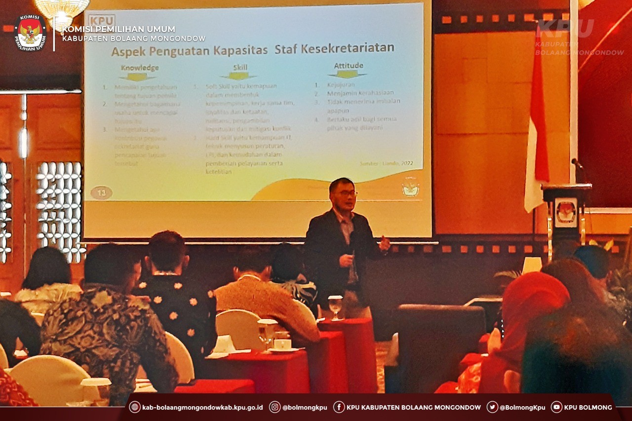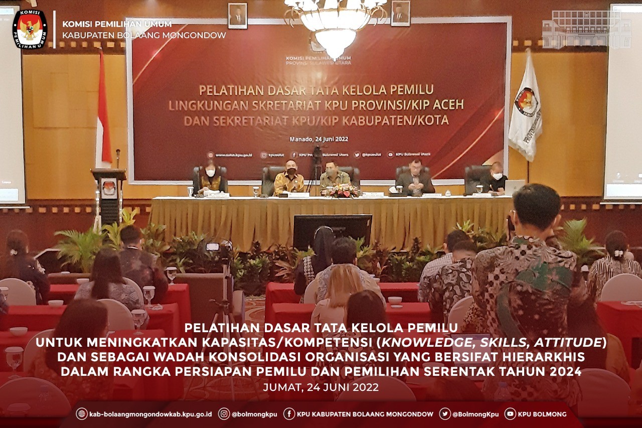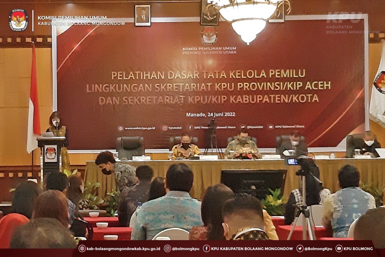 Lolak, kab-bolaangmongondow.kpu.go.id - Seluruh jajaran Pegawai Negeri Sipil (PNS) Sekretariat KPU Kabupaten Bolaang Mongondow mengikuti Pelatihan Dasar Tata Kelola Pemilu (TKP) Lingkungan Sekretariat KPU Provinsi, dan Sekretariat KPU Kabupaten/Kota se- Sulawesi Utara di Swiss-Bellhotel Maleosan Manado pada Jumat (24/6).