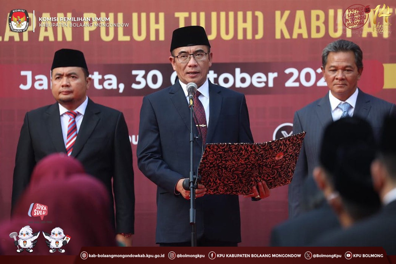 Lolak, kab-bolaangmongondow.kpu.go.id - Ketua KPU Hasyim Asy’ari, Anggota KPU Parsadaan Harahap, August Mellaz, Betty Epsilon Idroos, Mochammad Afifuddin, Idham Holik, dan Yulianto Sudrajat bersama Sekretaris Jenderal KPU Bernad Dermawan Sutrisno, memimpin langsung Pelantikan 5 Anggota KPU Kabupaten Bolaang Mongondow periode 2023-2028, yakni Afif Zuhri, Alfian B. Pobela, Jalaludin Koesasi, Sandi Satria Dama, dan Yohanes D. Tumengkol. Pelantikan tersebut dilaksanakan bersamaan dengan 86 kabupaten/kota lainnya pada 9 provinsi di Indonesia.