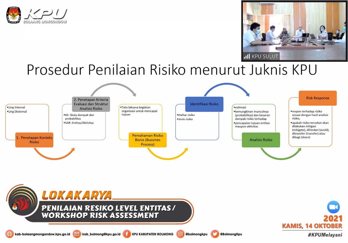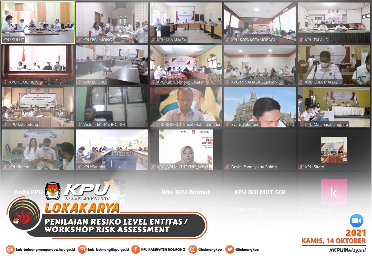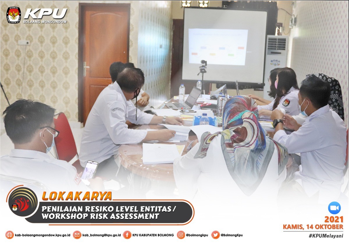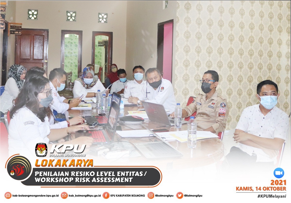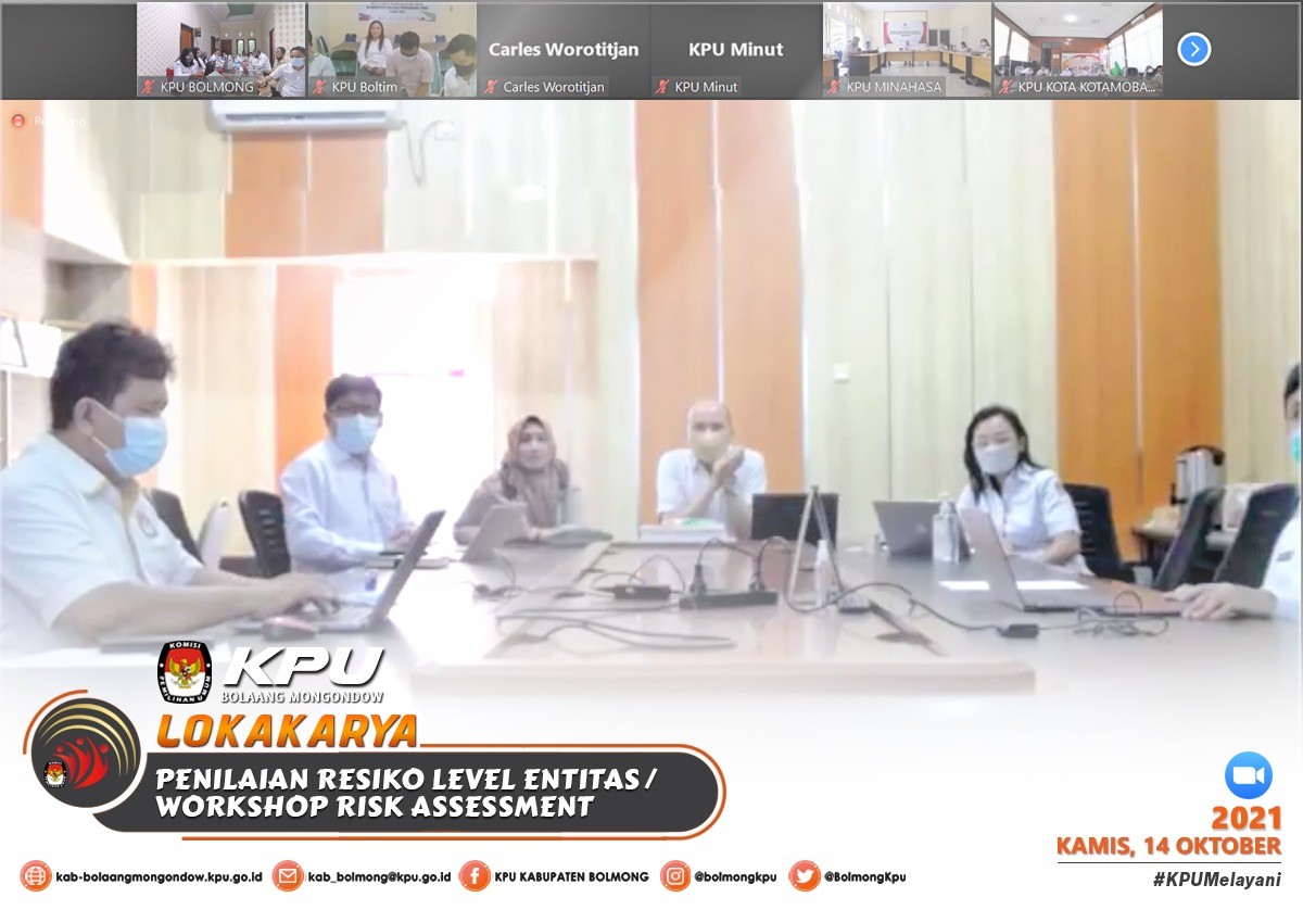 Lolak - Komisi Pemilihan Umum Kabupaten Bolaang Mongondow menghadiri Kegiatan Lokakarya Penilaian Resiko/Workshop Risk Assessment Level Entitas KPU Kabupaten/Kota, pada kamis (14/10), sesuai dengan undangan Komisi Pemilihan Umum Provinsi Sulawesi Utara Nomor : 386/PW.01/71/2021, Kegiatan ini merupakan tindak lanjut dari kegiatan Reinternalisasi SPIP dan Bimtek Risk Assessment yang telah dilaksanakan pada jumat (8/10) sebelumnya.