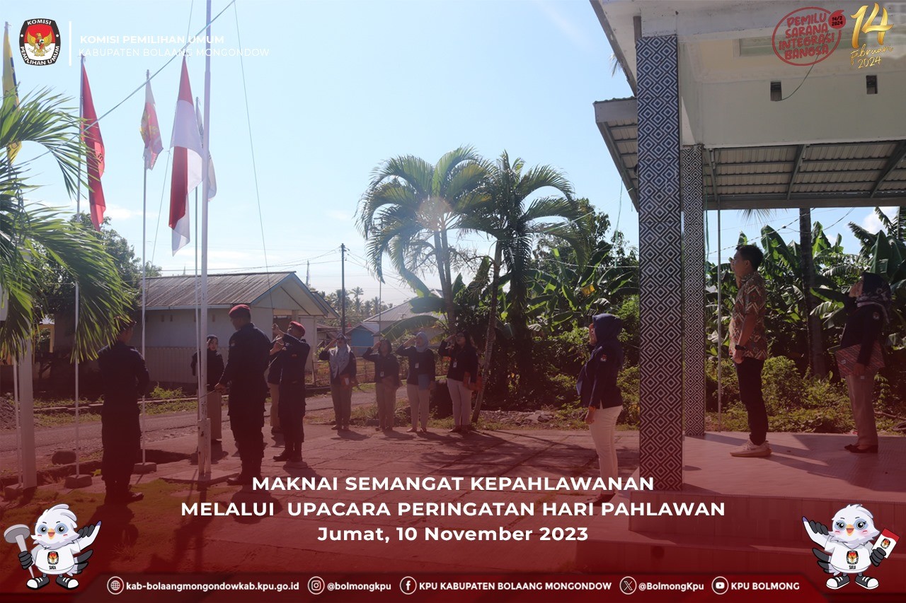 Lolak, kab-bolaangmongondow.kpu.go.id - Jumat (10/11/2023), Komisi Pemilihan Umum (KPU) Kabupaten Bolaang Mongondow (Bolmong) menggelar Upacara Peringatan Hari Pahlawan 2023 dengan tema "Semangat Pahlawan untuk Masa Depan Bangsa dalam Memerangi Kemiskinan dan Kebodohan". Berkesempatan menjadi Pembina Upacara Ketua, Divisi Hukum dan Pengawasan, Yohanes D. Tumengkol, dan sebagai Pemimpin Upacara, Kepala Sub Bagian Perencanaan, Data dan Informasi, Hapsari.