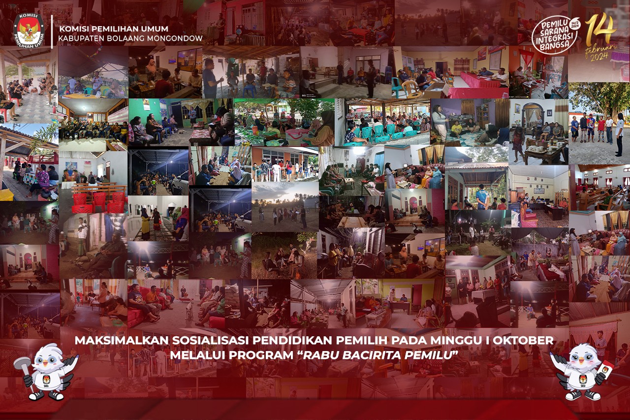 Lolak, kab.bolaangmongondow.kpu.go.id – pada minggu pertama bulan Oktober tahun 2023, Komisi Pemilihan Umum (KPU) Kabupaten Bolaang Mongondow (Bolmong) melalui Panitia Pemungutan Suara (PPS) terus perkuat sosialisasi pendidikan pemilih melalui program “Rabu Bacirita Pemilu” guna peningkatan partisipasi masyarakat dalam Pemilu 2024 (10/10).