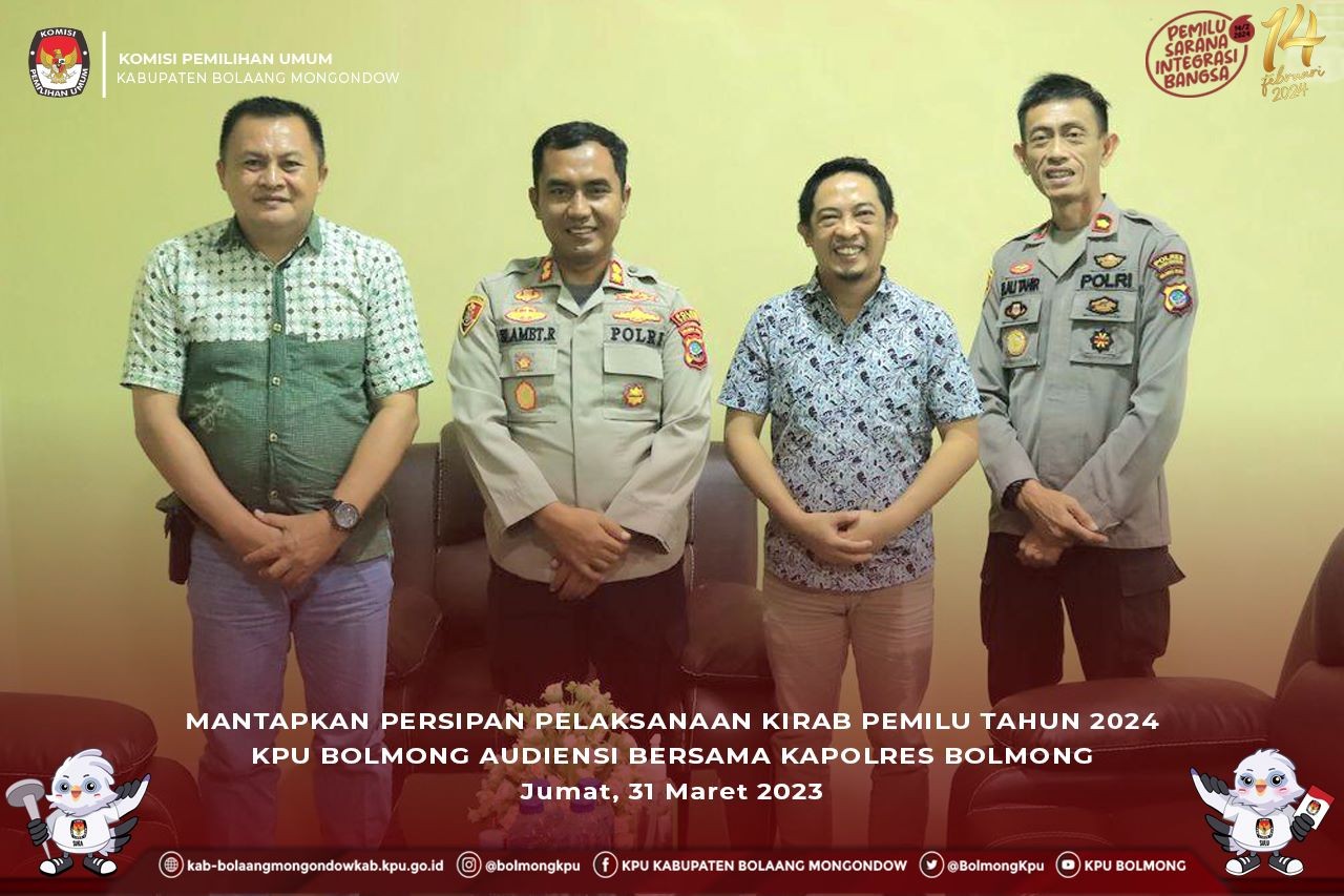 Lolak, kab-bolaangmongondow.kpu.go.id - Sejumlah upaya persiapan pelaksanaan Kirab Pemilu tahun 2024 yang akan digelar di Kabupaten Mongondow pada tanggal 12 s.d 17 April 2023 terus dilaksanakan oleh KPU Bolmong diantaranya berkoordinasi dengan stakeholder, dalam hal ini dengan pihak Polres Bolaang Mongondow.