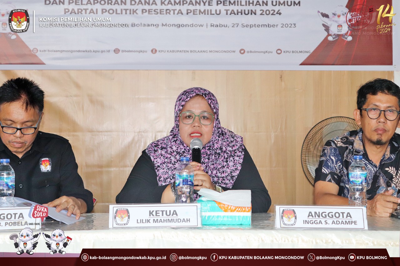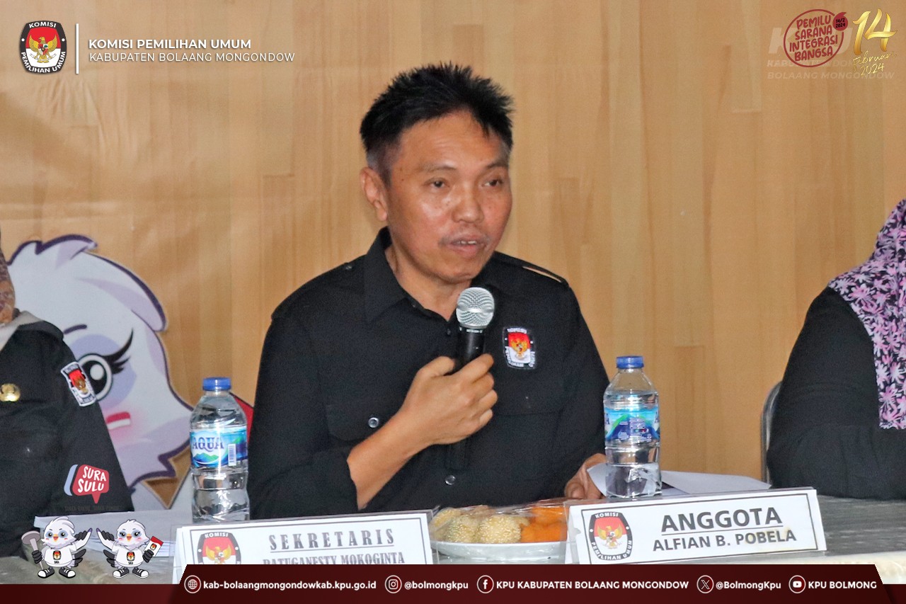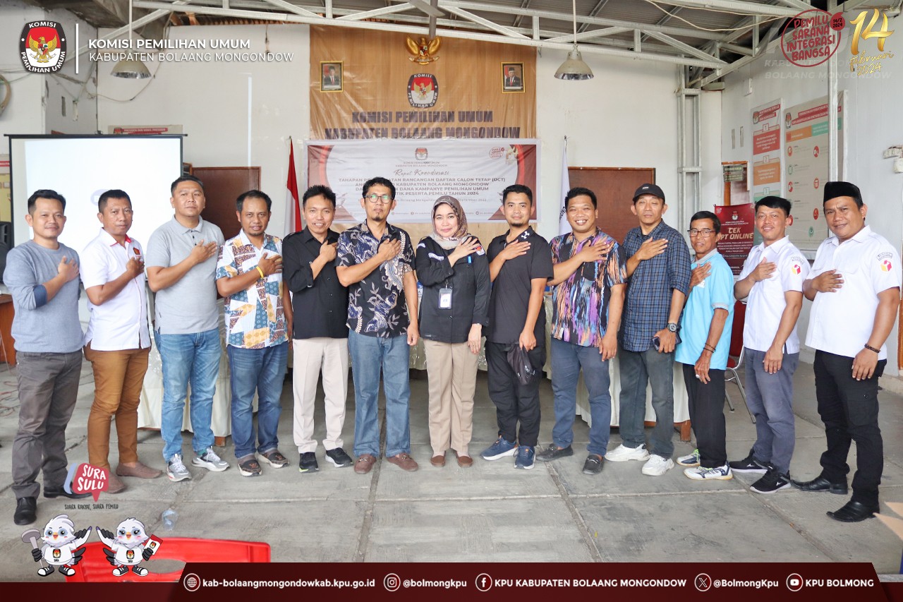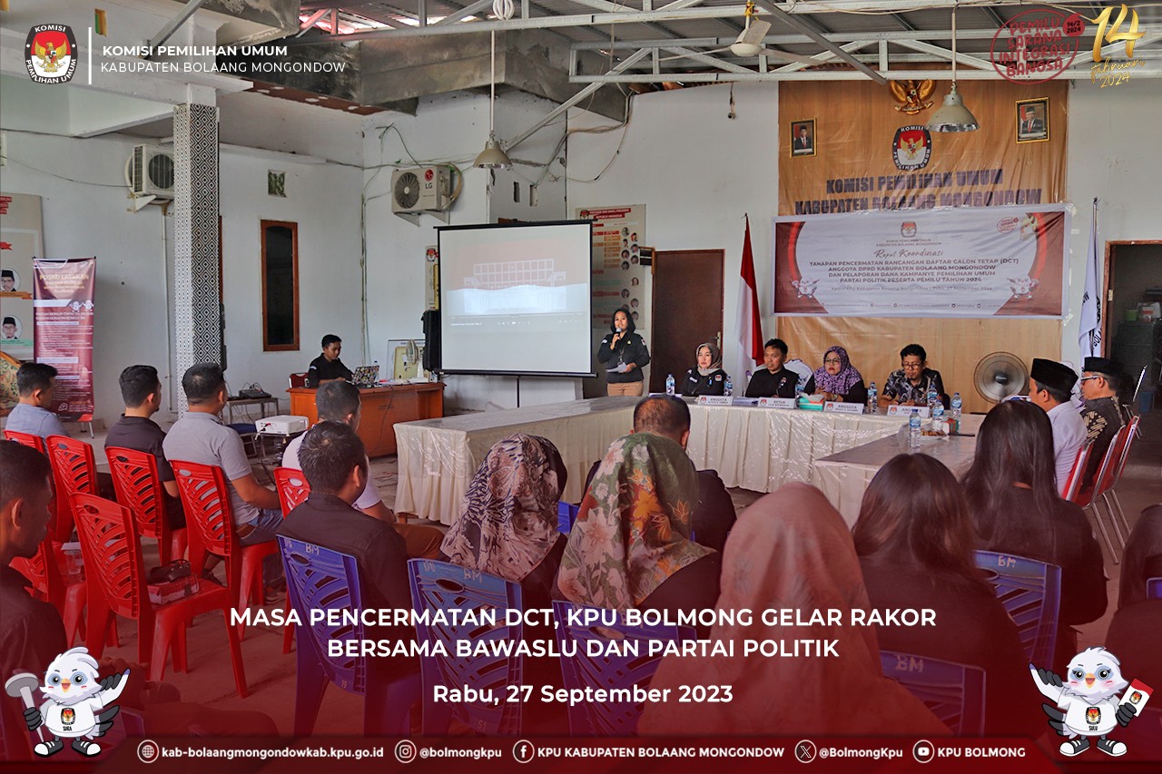 Lolak, kab.bolaangmongondow.kpu.go.id – Komisi Pemilihan Umum (KPU) Kabupaten Bolaang Mongondow (Bolmong) menggelar Rapat Koordinasi Pencermatan Daftar Calon Tetap (DCT) Anggota Dewan Perwakilan Rakyat Daerah Kabupaten Bolaang Mongondow dan Pelaporan Dana Kampanye Pemilihan Umum Partai Politik Peserta Pemilu Tahun 2024, Rabu (27/9).