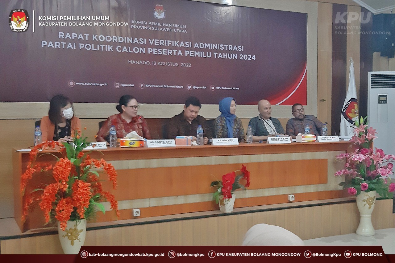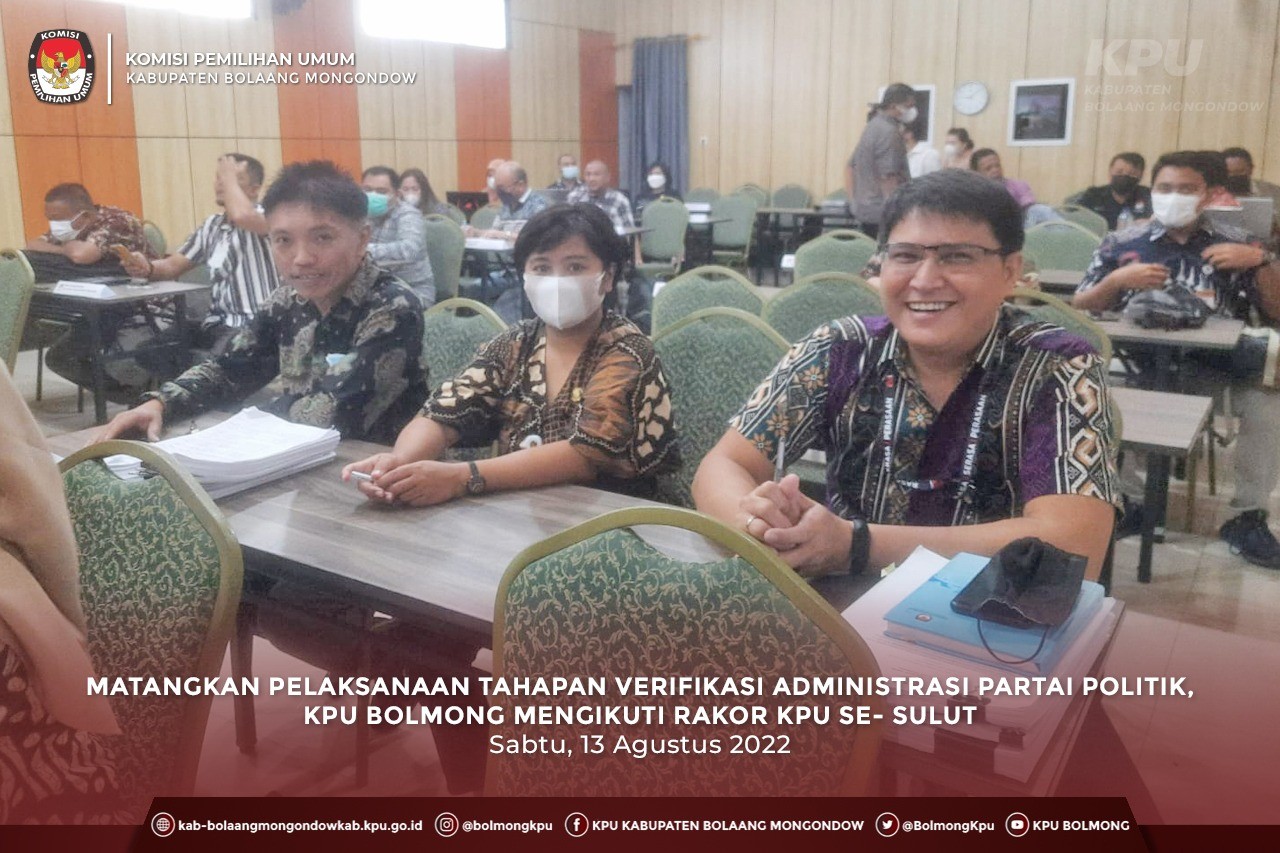 MATANGKAN PELAKSANAAN TAHAPAN VERIFIKASI ADMINISTRASI PARTAI POLITIK, KPU BOLMONG IKUTI RAKOR KPU SE-SULUT