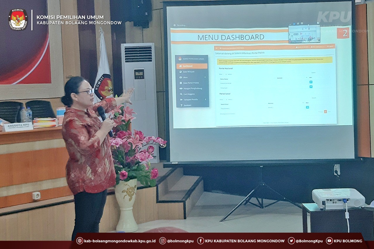 Pada sesi penyampaian materi oleh Ketua Divisi Teknis Penyelenggara KPU Sulut, Yessy Y. Momongan disampaikan terkait fitur-fitur yangada di dalam SIPOL serta penekanan terhadap tugas, wewenang, dan alur pelaksanaan tahapan verifikasi administrasi administrasi yang akan dilaksanakan oleh KPU Kabupaten/Kota, serta ditutup dengan sesi diskusi dan tanya-jawab.