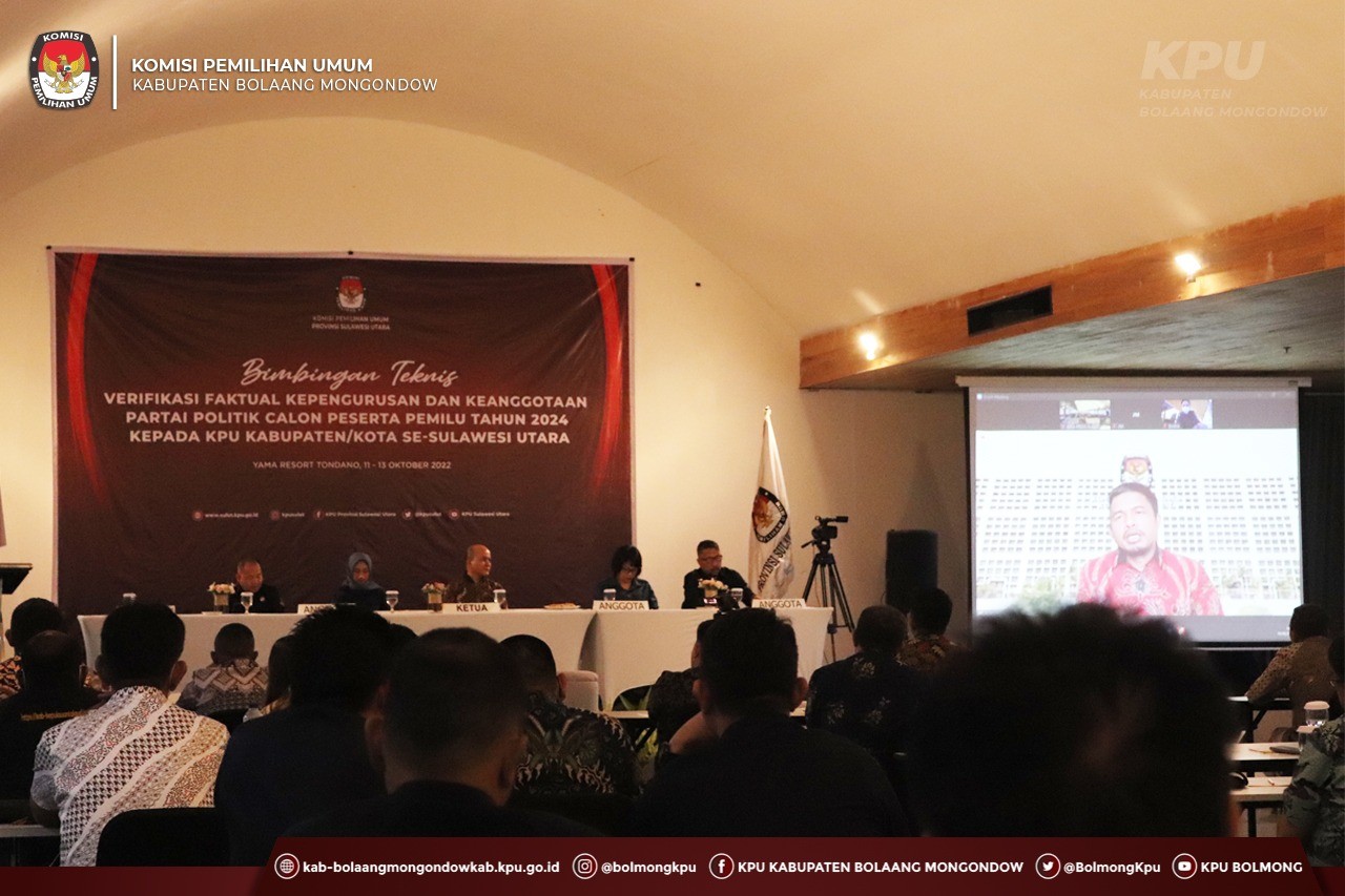 Lolak, kab-bolaangmongondow.kpu.go.id - Anggota KPU RI Divisi Teknis Penyelenggaraan, Idam Holik memberi pengarahan dalam kegiatan bimbingan teknis Verifikasi Faktual Kepengurusan dan Keanggotaan dengan KPU Kabupaten Kota se-Sulawesi Utara yang mengundang Komisioner, Sekretaris, Kasubag serta Verifikator sebagai peserta Bimtek di Yama Resort Minahasa sejak tanggal 11 – 13 Oktober 2022.
