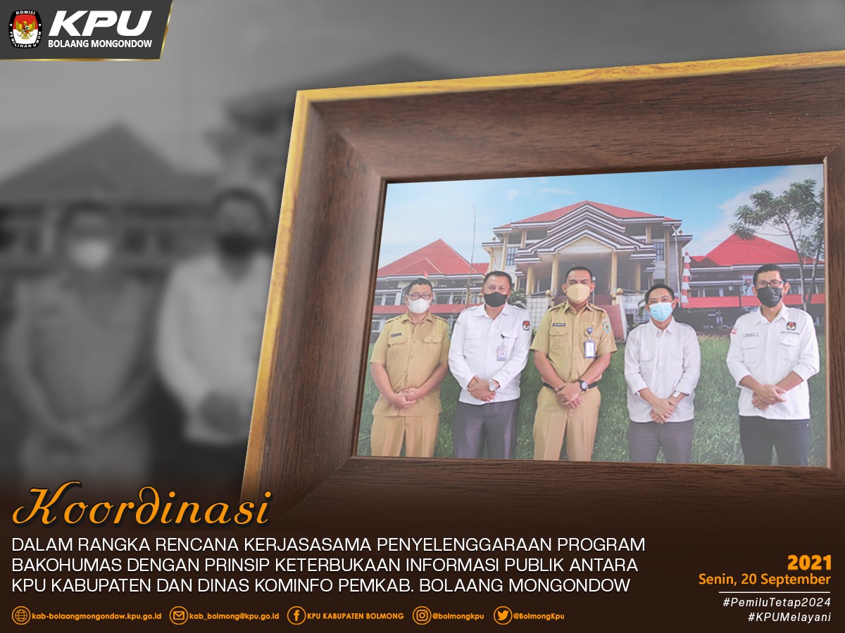 Lolak - Dalam rangka mengoptimalkan keterbukaan informasi publik dan untuk meningkatkan peran serta fungsi Badan Koordinasi Hubungan Masyarakat (Bakohumas) antara KPU Kabupaten dengan Pemerintah Daerah, sebagaimana amanat UU Nomor 14 Tahun 2008 dan Keputusan KPU Nomor 561/HM.03.5-Kpt/06/KPU/VIII/2021, dengan mengacu pada Keputusan KPU Nomor 542/HM/03.5-Kpt/06/KPU/VIII/2021, maka Ketua Divisi Sosialisasi Pendidikan Pemilih, Partisipasi Masyarakat dan SDM, Hasrul Dumambow bersama Ketua Divisi Hukum dan Pengawasan, Ingga S. Adampe, didampingi Sekretaris, Meydi Wolah bersama jajaran Sekretariat KPU Kabupaten Bolaang Mongondow melaksanakan audiensi ke Kantor Dinas Komunikasi dan Informasi (Diskominfo) Kabupaten Bolaang Mongondow (Bolmong) pada, Senin (20/9).