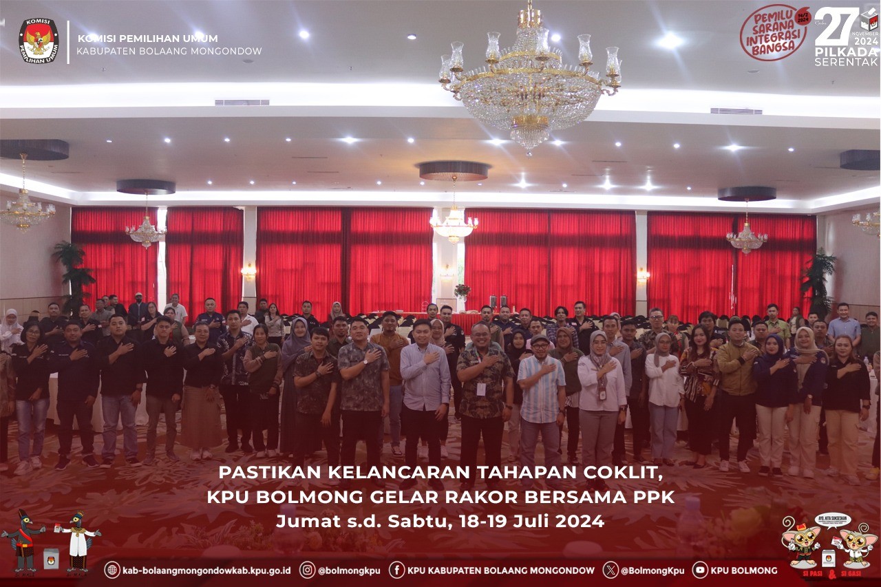 Lolak, kab-bolaangmongondow.kpu.go.id - Plh. Ketua Komisi Pemilihan Umum (KPU) Kabupaten Bolaang Mongondow (Bolmong), Jalaludin Koesasi membuka kegiatan Rapat Koordinasi Tindak Lanjut Data TMS, Pindah Masuk Keluar dari KPU RI Untuk Pemilihan Kepala Daerah Tahun 2024 bersama Panitia Pemilihan Kecamatan (PPK) se- Bolmong, yang digelar sejak tanggal 18-19 Juli 2024.
