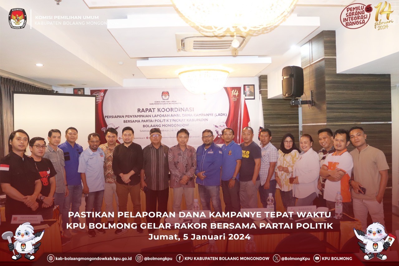 Kegiatan ini dibuka oleh Ketua KPU Bolmong, Afif Zuhri, beliau menyampaikan bahwa rakor ini merupakan bagian dari upaya KPU untuk memastikan Partai Politik peserta Pemilu dapat menyampaikan LADK tepat waktu, yaitu pada tanggal 7 Januari 2024, sebagaimana diatur dalam Peraturan KPU Nomor 18 Tahun 2023 tentang Dana Kampanye Pemilihan Umum. Ditegaskan pula bahwa Partai Politik peserta Pemilu wajib menyampaikan laporan dimaksud, karena akan berimplikasi pada pembatalan kepesertaannya dalam Pemilu tahun 2024 jika tidak dilaksanakan pelaporan.