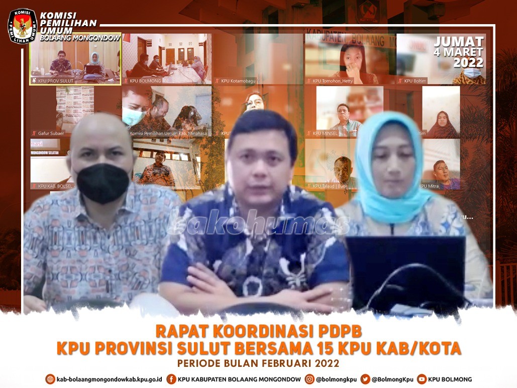 Lolak, kab.bolaangmongondow.kpu.go.id - Afif Zuhri selaku Ketua Divisi Perencanaan, Data dan Informasi KPU Kabupaten Bolaang Mongondow, Ratuganesty Mokoginta selaku Kepala Subbagian Program dan Data serta Lendi Mamonto, Operator Sidalih pada Jumat,4 Maret 2022 mengikuti Rapat Koordinasi Pemutakhiran Data Pemilih Berkelanjutan yang digelar KPU Provinsi Sulawesi Utara sesuai surat undangan Nomor 73/TIK.04/71/2022 tanggal 2 Maret 2022 perihal undangan.Rapat Koordinasi ini dihadiri juga oleh KPU Kab/Kota se-Sulawesi Utara.