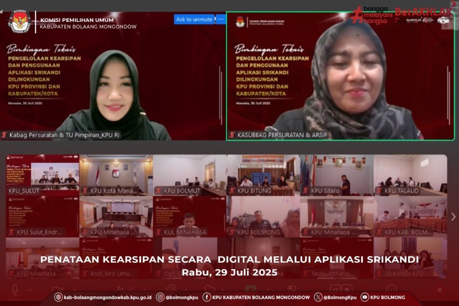 Lolak, kab-bolaangmongondow.kpu.go.id - Rabu, 30 Juli 2025, KPU Kabupaten Bolaang Mongondow mengikuti Bimbingan Teknis (Bimtek) Pengelolaan Kearsipan dan Penggunaan Aplikasi Srikandi di lingkungan KPU Provinsi dan KPU Kabupaten/Kota Se Sulawesi Utara.