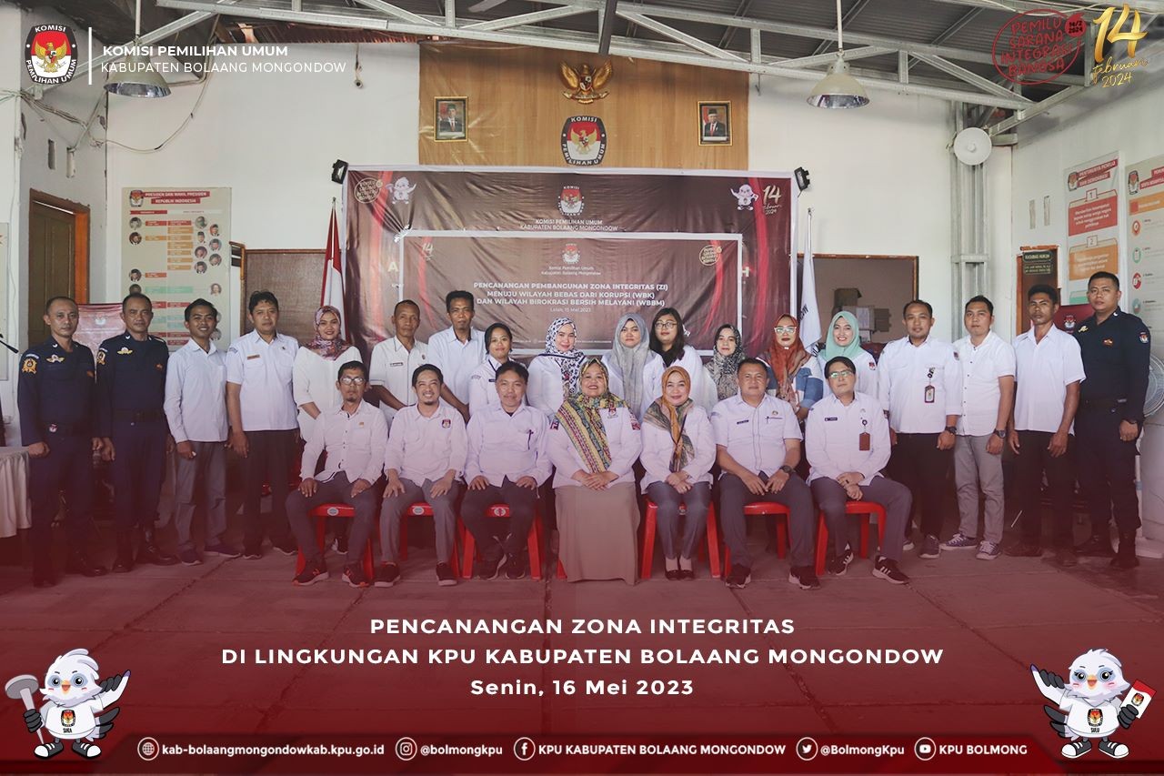 Lolak, kab-bolaangmongondow.kpu.go.id - Senin,15 Mei 2023 dilaksanakan Pencanangan Zona Integritas Menuju Wilayah Bebas Korupsi (WBK) dan Wilayah Birokrasi Bersih Melayani (WBBM) di KPU Bolaang Mongondow yang ditandai dengan Penandatangan Piagam Pencanangan Zona Integritas.
