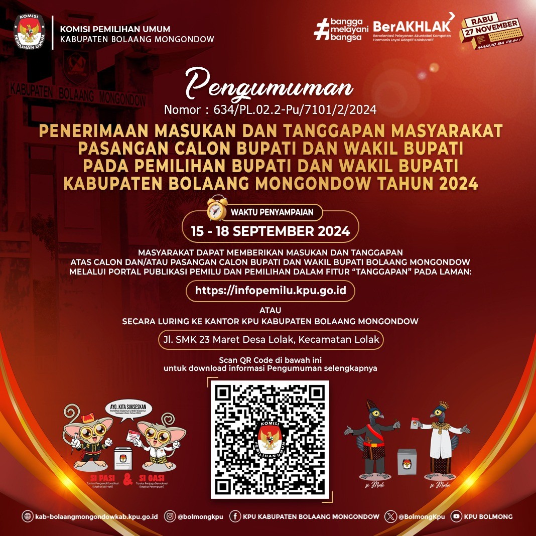 Lolak,https://kab-bolaangmongondow.kpu.go.id/ - Bahwa untuk melaksanakan ketentuan Pasal 137 Peraturan KPU Nomor 8 Tahun 2024 tentang Pencalonan Gubernur dan Wakil Gubernur, Bupati dan Wakil Bupati, serta Walikota dan Wakil Walikota yang telah diubah dengan Peraturan KPU Nomor 10 Tahun 2024 tentang Perubahan Atas Peraturan KPU Nomor 8 Tahun 2024 tentang Pencalonan Gubernur dan Wakil Gubernur, Bupati dan Wakil Bupati, serta Walikota dan Wakil Walikota, Komisi Pemilihan Umum Kabupaten Bolaang Mongondow mengumumkan Penerimaan Masukan dan Tanggapan Masyarakat terhadap Pasangan Calon Bupati dan Wakil Bupati Bolaang Mongondow.