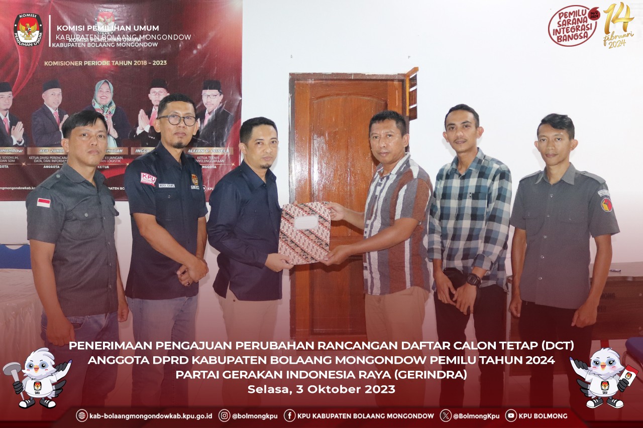 PENERIMAAN PENGAJUAN PERUBAHAN RANCANGAN DAFTAR CALON TETAP (DCT) ANGGOTA DPRD KABUPATEN BOLAANG MONGONDOW PEMILU TAHUN 2024 PARTAI GERAKAN INDONESIA RAYA (GERINDRA)