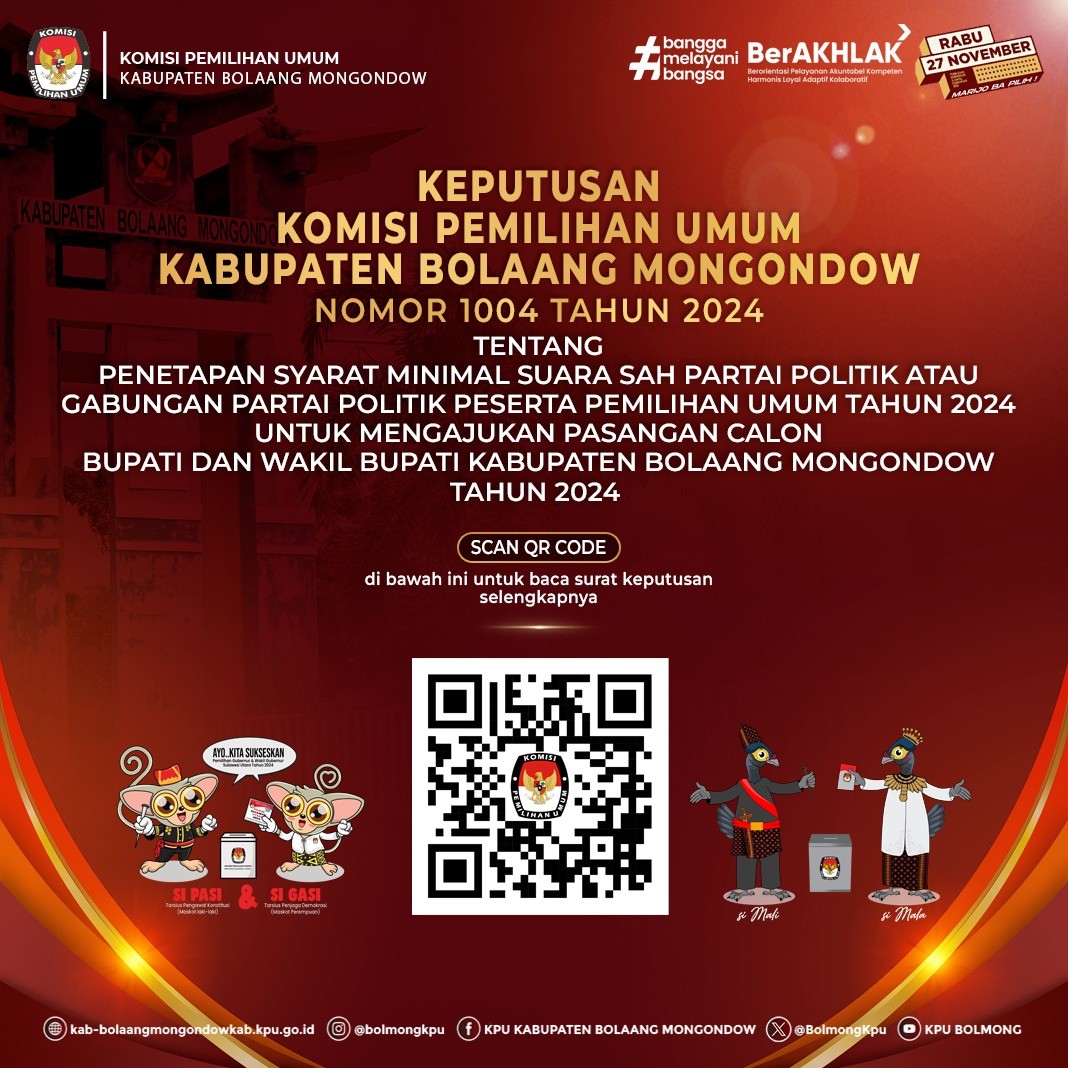 PENETAPAN SYARAT MINIMAL SUARA SAH PARTAI POLITIK ATAU GABUNGAN PARTAI POLITIK PESERTA PEMILIHAN UMUM TAHUN 2024 UNTUK MENGAJUKAN PASANGAN CALON PADA PEMILIHAN BUPATI DAN WAKIL BUPATI KABUPATEN BOLAANG MONGONDOW TAHUN 2024
