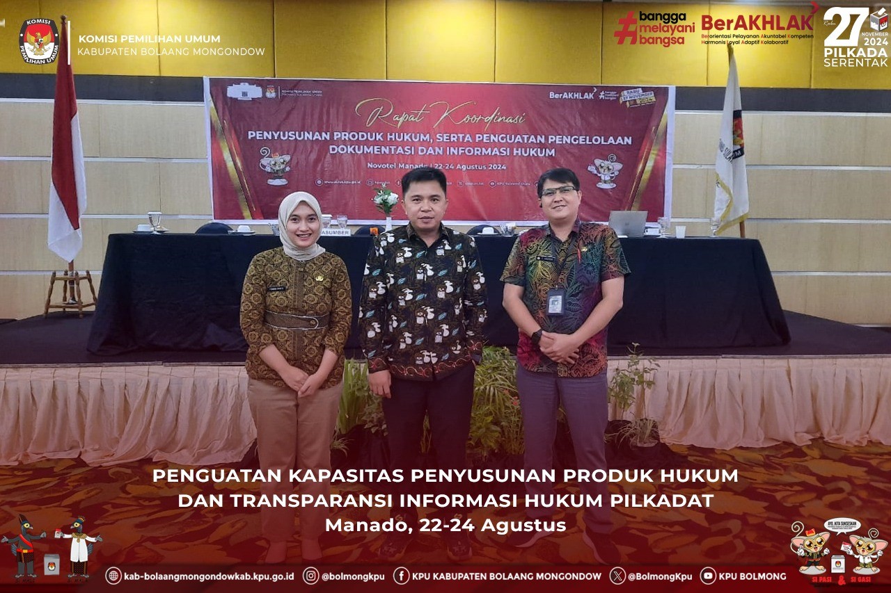 Lolak, kab-bolaangmongondow.kpu.go.id - Komisi Pemilihan Umum (KPU) Kabupaten Bolaang Mongondow (Bolmong) mengikuti kegiatan Rapat Koordinasi Penyusunan Produk Hukum dan Penguatan Pengelolaan Dokumentasi serta Informasi Hukum di Novotel Manado Golf Resort & Convention Center, sejak tanggal 22 hingga 24 Agustus 2024.