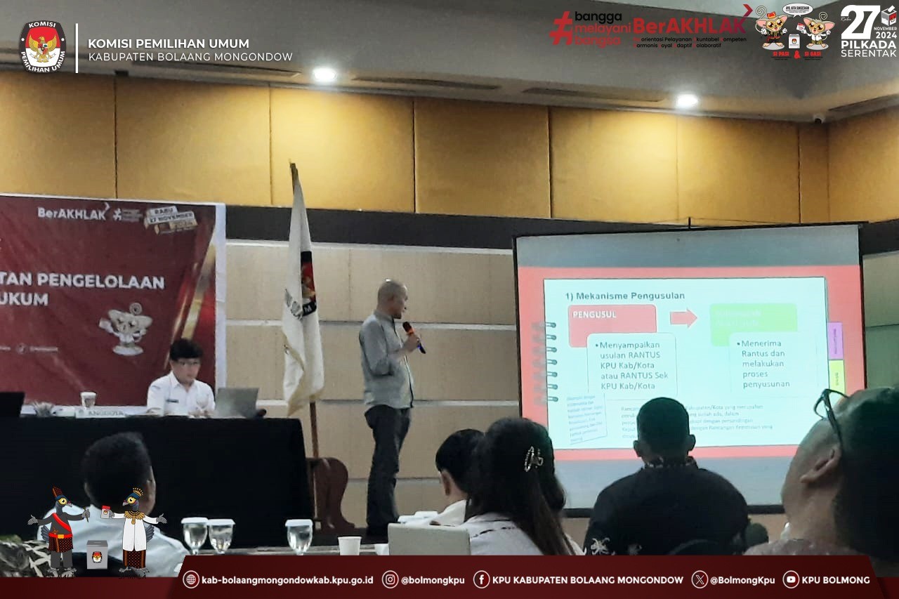 Kegiatan dilanjutkan dengan penyampaian materi oleh Ketua Divisi Hukum dan Pengawasan KPU Sulut Meidy Tinangon yang dipandu Kepala Bagian Teknis Penyelenggaraan, Parhubmas, Hukum dan SDM KPU Sulut Carles Worotitjan, membahas mengenai mekanisme dan teknik penyusunan keputusan di lingkungan KPU.