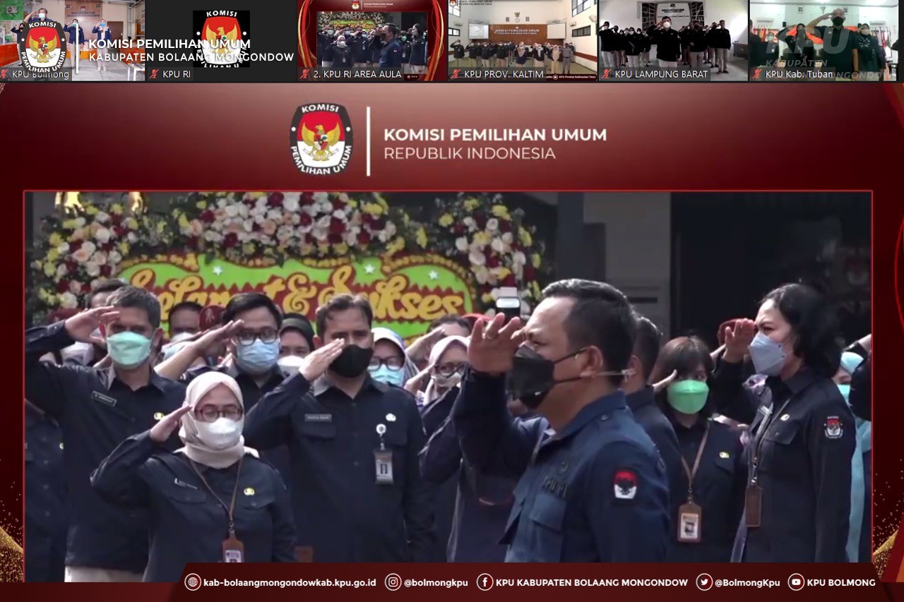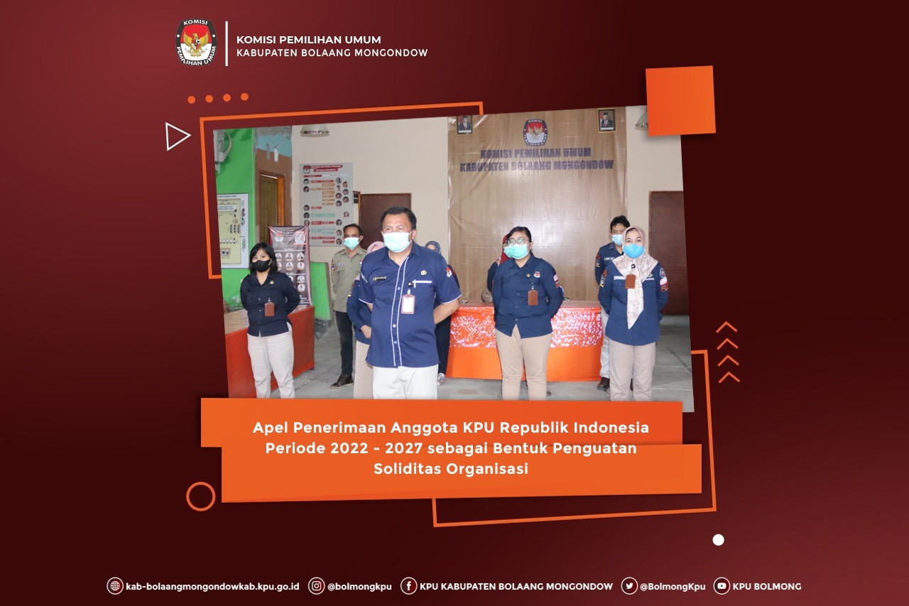 Lolak, kab-bolaangmongondow.kpu.go.id - Dalam rangka penguatan soliditas organisasi, Sekretariat Jenderal Komisi Pemilihan Umum RI melaksanakan Apel Penerimaan Anggota KPU RI Periode 2022-2027 yang baru saja dilantik oleh Presiden Republik Indonesia, Ir. H. Joko Widodo di Istana Negara pada Rabu (12/4).