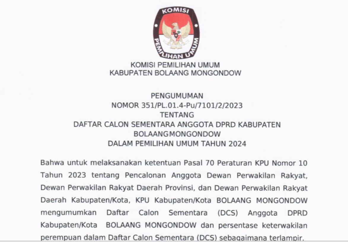 Lolak, kab-bolaangmongondow.kpu.go.id - Bahwa untuk melaksanakan ketentuan Pasal 70 Peraturan KPU Nomor 10 Tahun 2023 tentang Pencalonan Anggota Dewan Perwakilan Rakyat, Dewan Perwakilan Rakyat Daerah Provinsi, dan Dewan Perwakilan Rakyat Daerah Kabupaten/Kota, KPU KABUPATEN BOLAANG MONGONDOW mengumumkan Daftar Calon Sementara (DCS) Anggota DPRD KABUPATEN BOLAANG MONGONDOW dan persentase keterwakilan perempuan dalam Daftar Calon Sementara (DCS) sebagaimana terlampir.