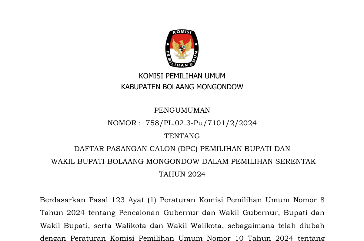 PENGUMUMAN DAFTAR PASANGAN CALON PEMILIHAN BUPATI DAN WAKIL BOLAANG MONGONDOW PADA PEMILIHAN SERENTAK 2024