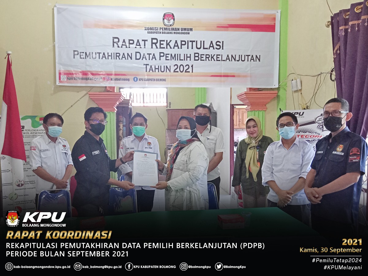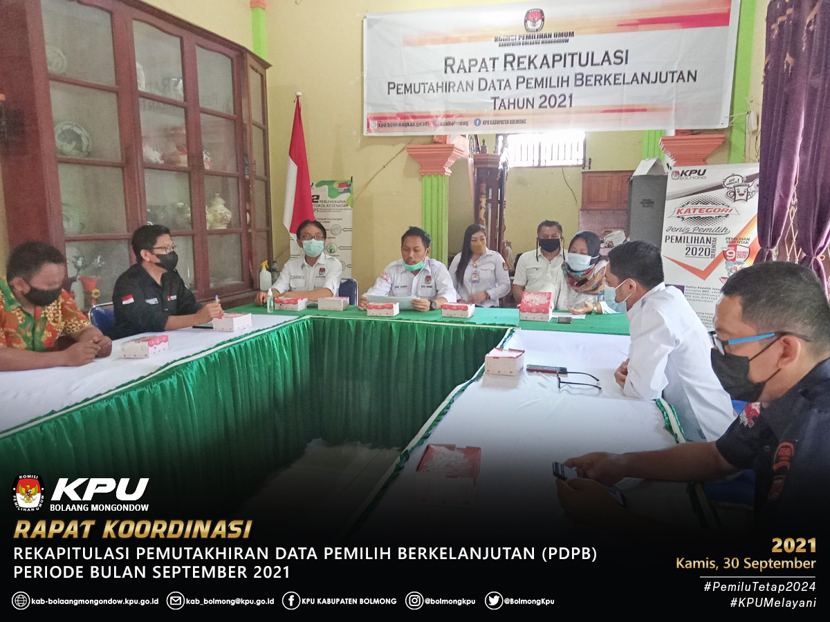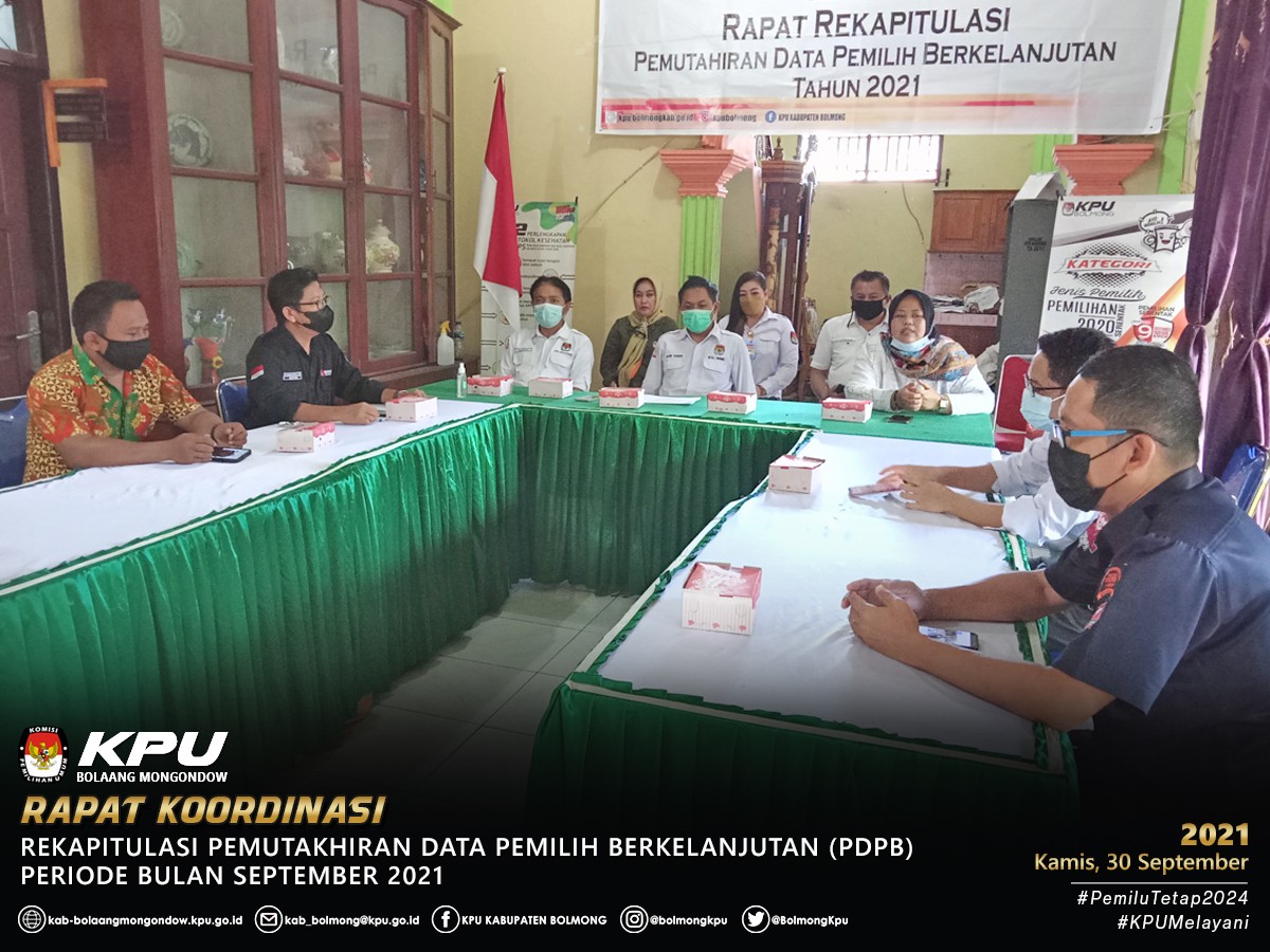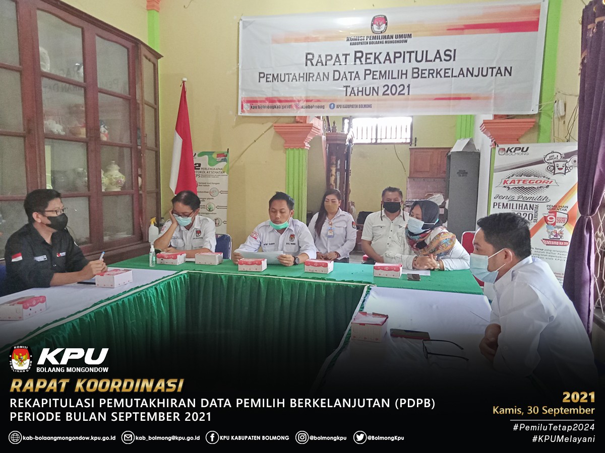 Lolak - Dalam rangka menindaklanjuti Surat Dinas Plt. Ketua KPU RI Nomor 132/PL.02-SD/01/KPU/II/2021 tanggal 4 Februari 2021 perihal Pemutakhiran Data Pemilih Berkelanjutan Tahun 2021, sebagaimana telah diubah dengan Surat Dinas Ketua KPU RI Nomor 366/PL.02-SD/01/KPU/IV/2021 tanggal 21 April 2021 perihal Perubahan Surat Dinas Plt. Ketua KPU RI Nomor 132/PL.02-SD/01/KPU/II/2021 perihal Pemutakhiran Data Pemilih Berkelanjutan (PDPB) Tahun 2021, maka KPU Kabupaten Bolaang Mongondow pada Kamis (30/9/2021), telah melaksanakan Rapat Koordinasi Rekapitulasi Pemutakhiran Data Pemilih Berkelanjutan Tahun 2021 Periode bulan September 2021 bertempat di Kantor KPU Kabupaten Bolaang Mongondow, dengan penerapan protokol kesehatan pencegahan dan pengendalian Covid-19. Kegiatan yang merupakan agenda rutin ini turut dihadiri oleh Bawaslu Kabupaten Bolaang Mongondow.