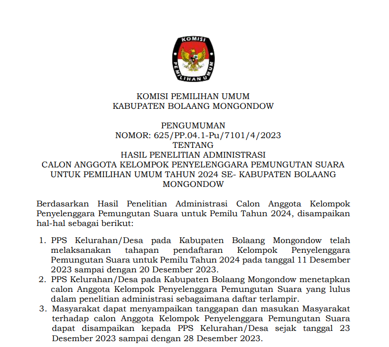 PENGUMUMAN HASIL PENELITIAN ADMINISTRASI CALON ANGGOTA KPPS PEMILU TAHUN 2024 Sabtu, 23 Desember 2023 07:00 112 PENGUMUMAN SELENGKAPNYA {KLIK DISINI} Bagikan: Dilihat 112 Kali.