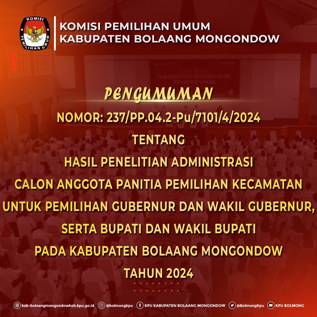 PENGUMUMAN HASIL PENELITIAN ADMINISTRASI CALON ANGGOTA PPK UNTUK PEMILIHAN GUBERNUR DAN WAKIL GUBERNUR, SERTA BUPATI DAN WAKIL BUPATI PADA KABUPATEN BOLAANG MONGONDOW TAHUN 2024