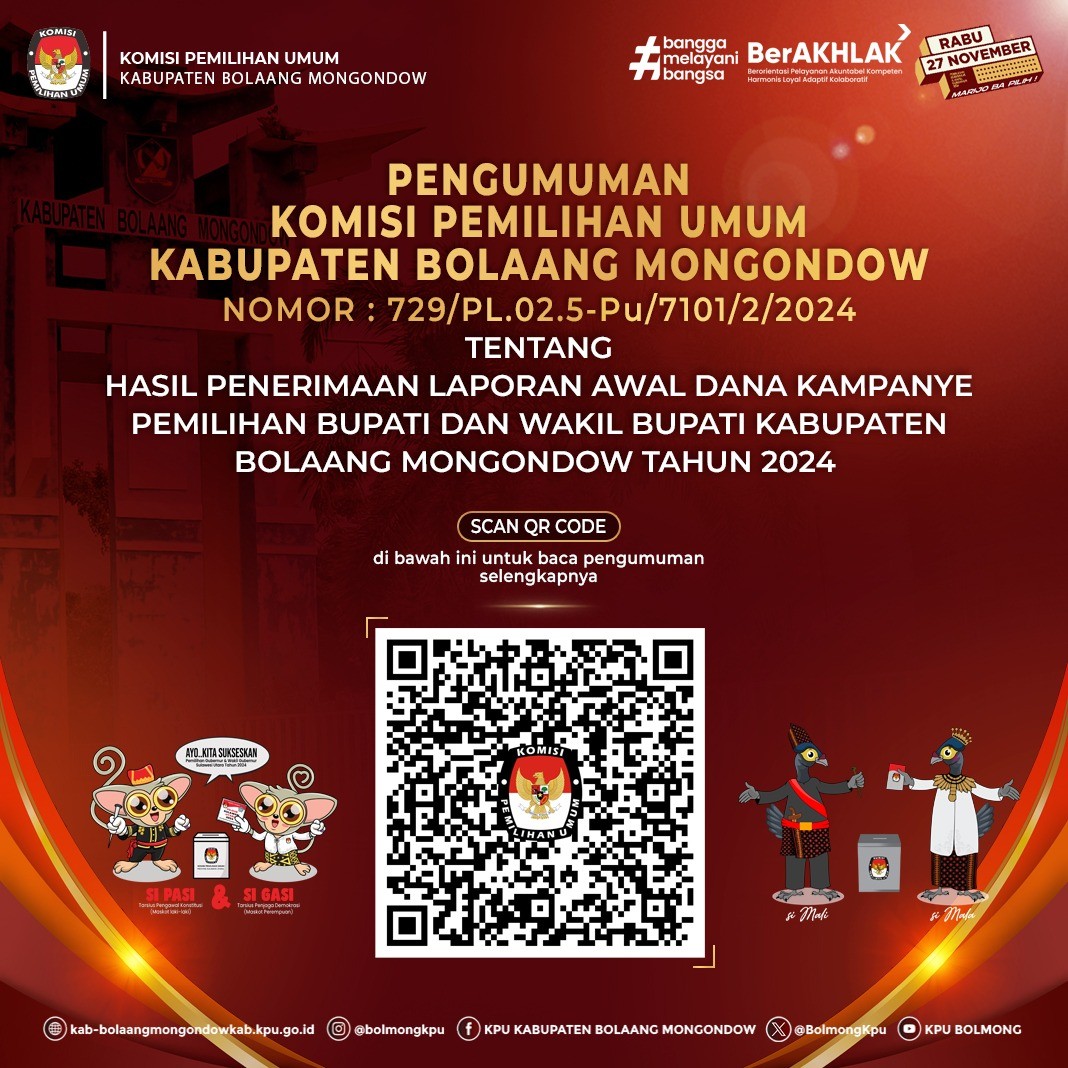 Berikut Pengumuman Hasil Penerimaan Laporan Awal Dana Kampanye Pemilihan Bupati Dan Wakil Bupati Kabupaten Bolaang Mongondow Tahun 2024.