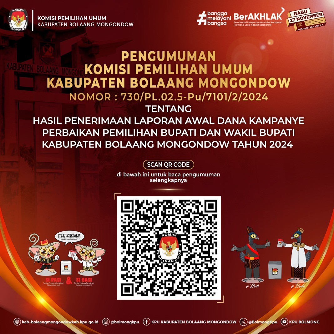 Berikut Pengumuman Hasil Penerimaan Laporan Awal Dana Kampanye Perbaikan Pemilihan Bupati Dan Wakil Bupati Kabupaten Bolaang Mongondow Tahun 2024.