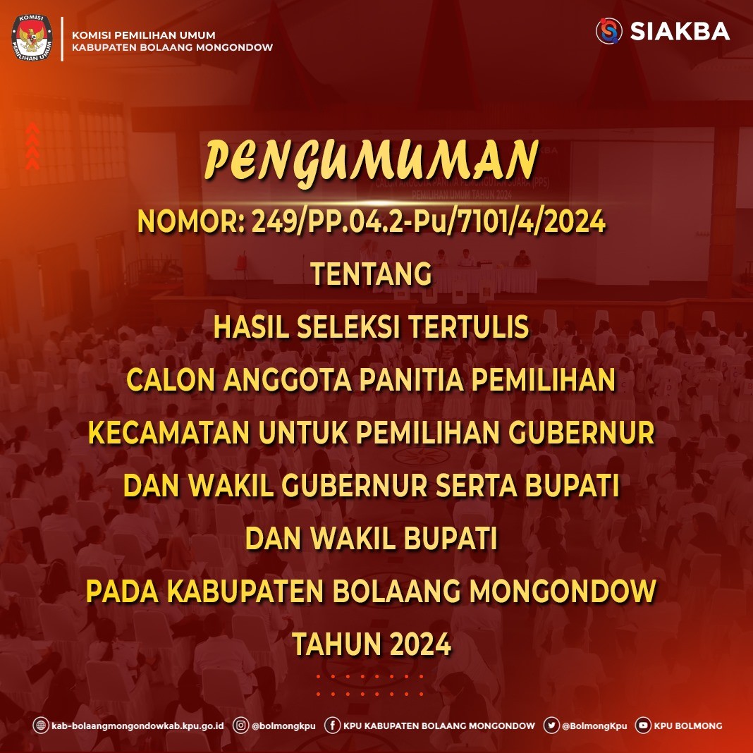 PENGUMUMAN HASIL SELEKSI TERTULIS CALON ANGGOTA PPK UNTUK PEMILIHAN GUBERNUR DAN WAKIL GUBERNUR SERTA BUPATI DAN WAKIL BUPATI PADA KABUPATEN BOLAANG MONGONDOW TAHUN 2024