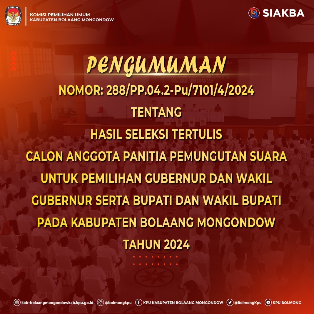 PENGUMUMAN HASIL SELEKSI TERTULIS CALON ANGGOTA PPS UNTUK PEMILIHAN GUBERNUR DAN WAKIL GUBERNUR SERTA BUPATI DAN WAKIL BUPATI PADA KABUPATEN BOLAANG MONGONDOW TAHUN 2024