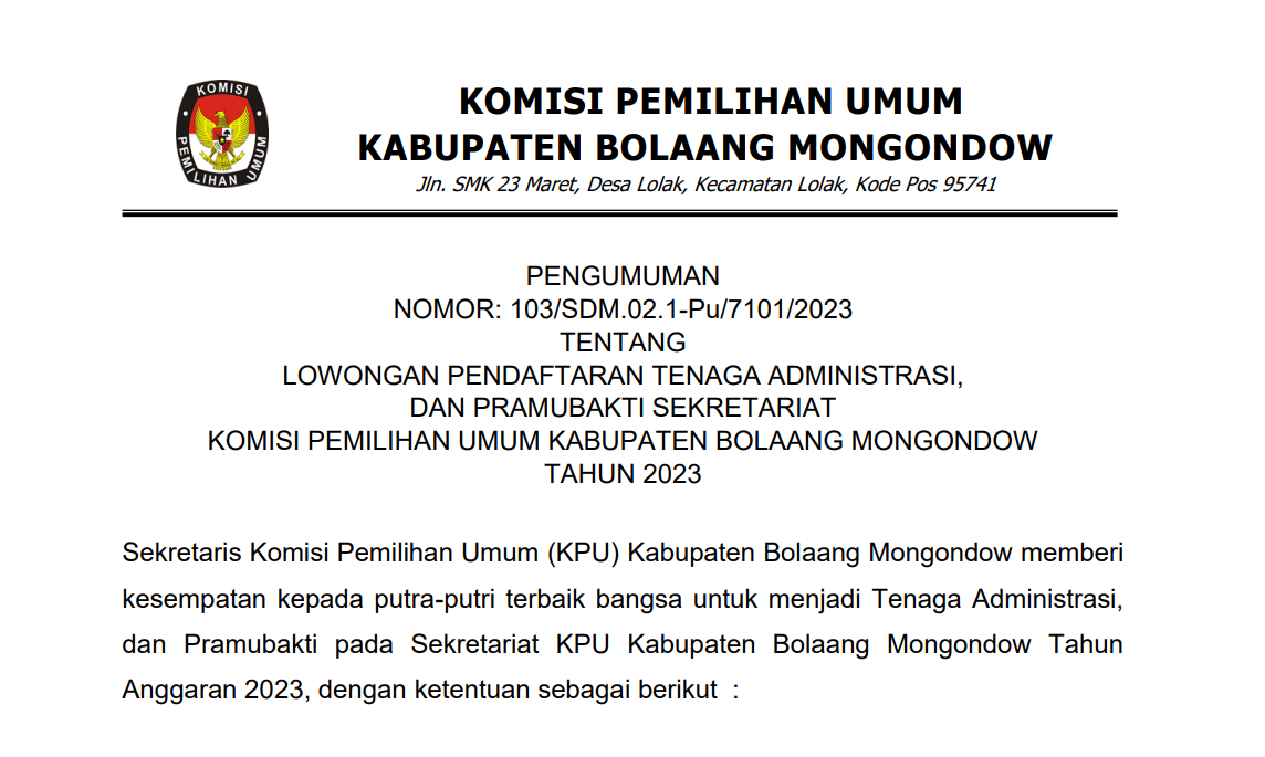 PENGUMUMAN LOWONGAN PENDAFTARAN TENAGA ADMINISTRASI, DAN PRAMUBAKTI SEKRETARIAT KOMISI PEMILIHAN UMUM KABUPATEN BOLAANG MONGONDOW TAHUN 2023