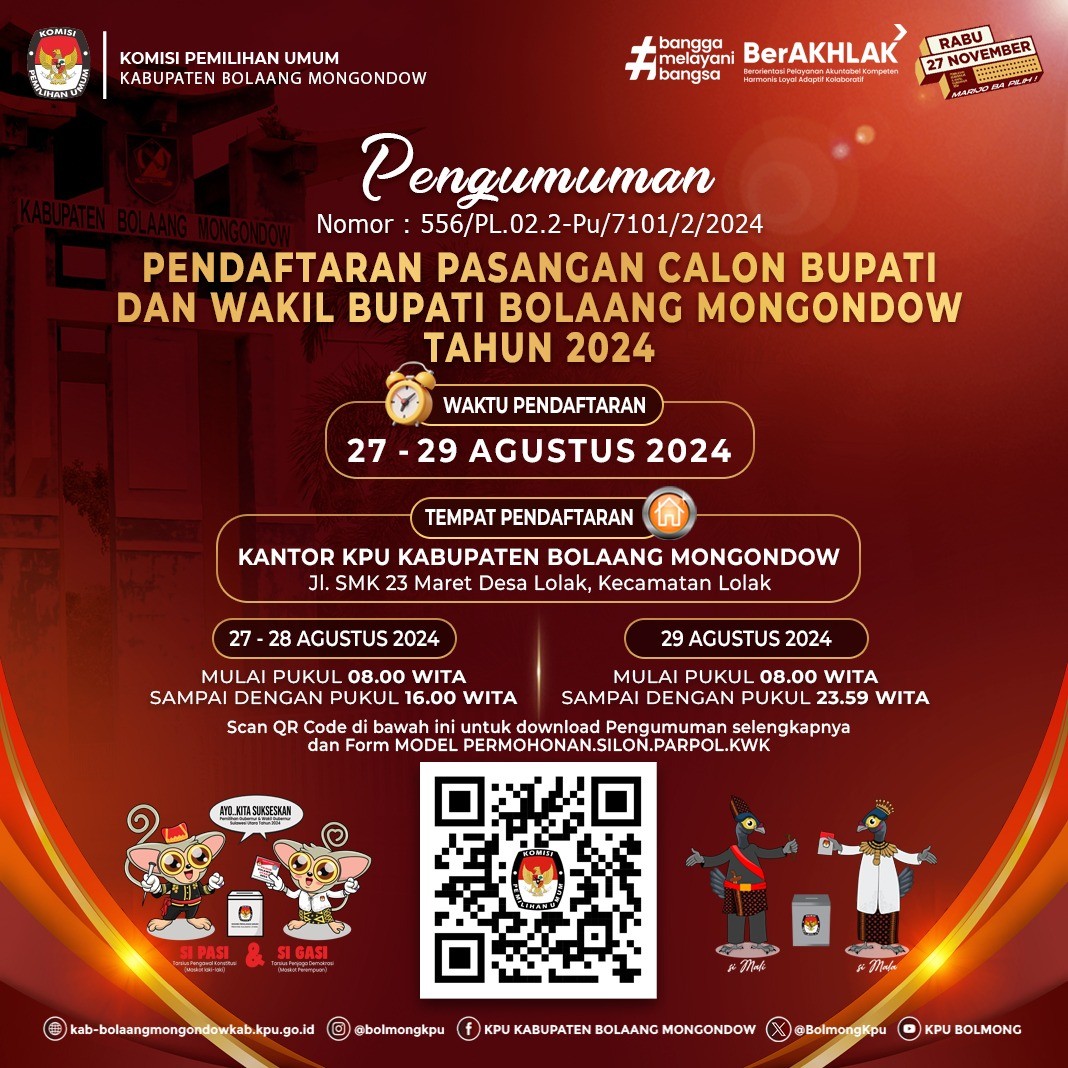 PENGUMUMAN PENDAFTARAN PASANGAN CALON BUPATI DAN WAKIL BUPATI BOLAANG MONGONDOW TAHUN 2024