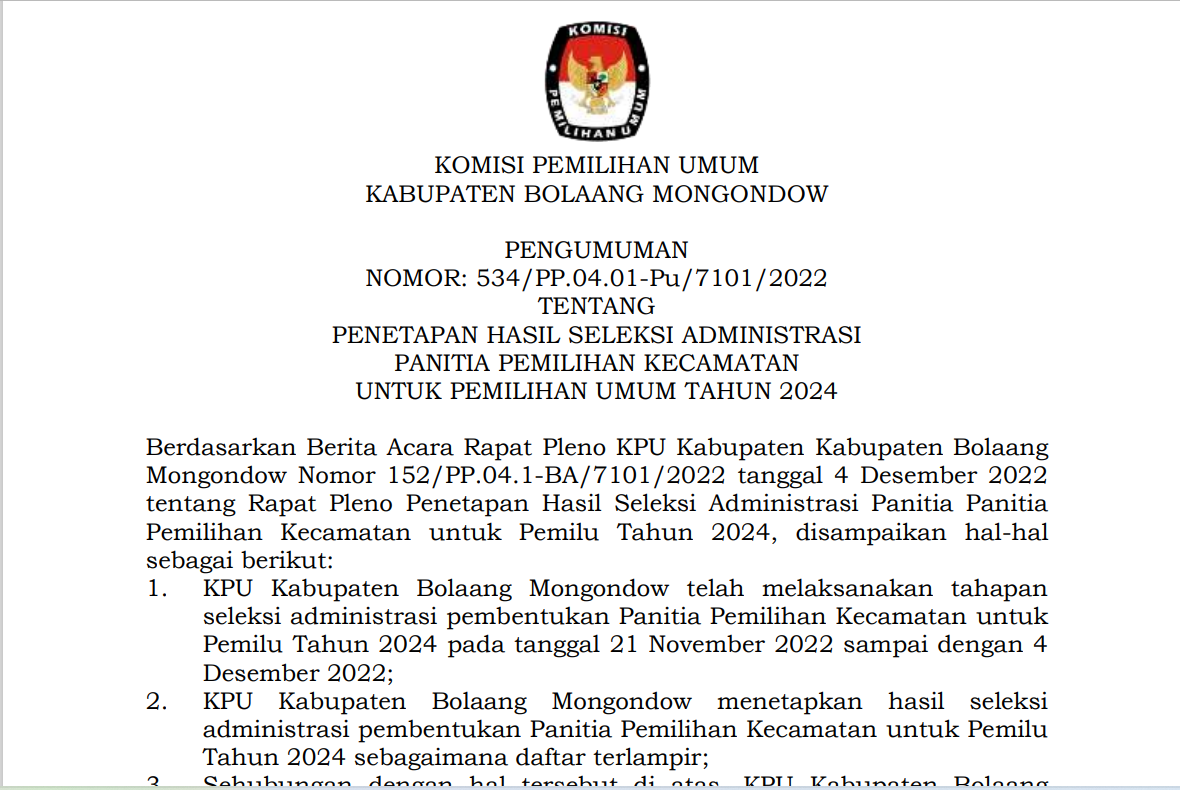 Lolak, kab.bolaangmongondow.kpu.go.id - Berdasarkan Berita Acara Rapat Pleno KPU Kabupaten Kabupaten Bolaang Mongondow Nomor 152/PP.04.1-BA/7101/2022 tanggal 4 Desember 2022 tentang Rapat Pleno Penetapan Hasil Seleksi Administrasi Panitia Panitia Pemilihan Kecamatan untuk Pemilu Tahun 2024, maka KPU Kabupaten Bolaang Mongondow telah mengumumkan Penetapan Hasil Seleksi Administrasi Panitia Pemilihan Kecamatan Untuk Pemilihan Umum Tahun 2024.