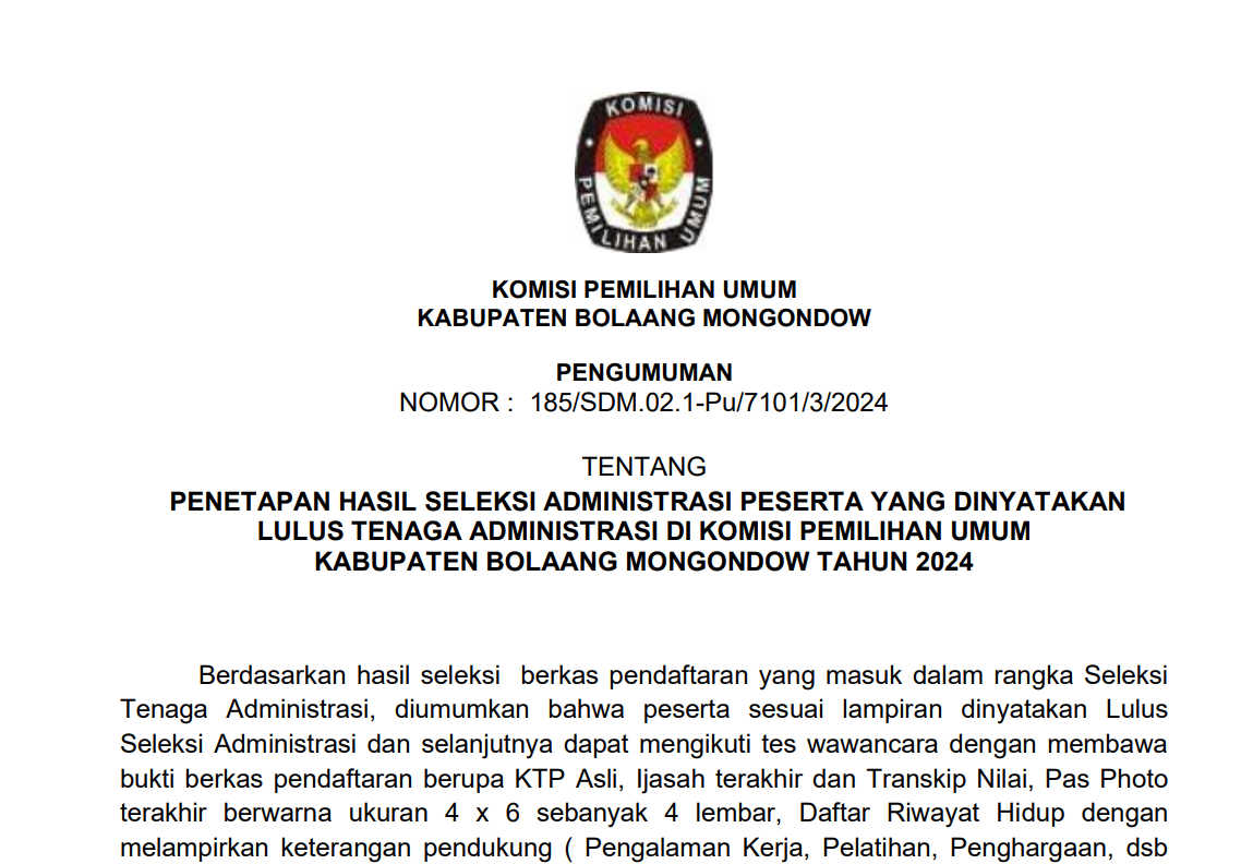 PENGUMUMAN PENETAPAN HASIL SELEKSI ADMINISTRASI PESERTA YANG DINYATAKAN LULUS TENAGA ADMINISTRASI DI KOMISI PEMILIHAN UMUM KABUPATEN BOLAANG MONGONDOW TAHUN 2024 Minggu, 03 Maret 2024 07:00 367 PENGUMUMAN SELENGKAPNYA {KLIK DISINI} Bagikan: Dilihat 367 Kali.