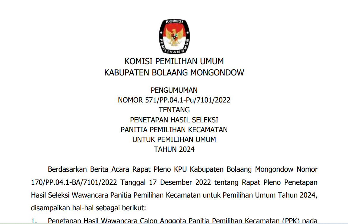 Lolak, kab-bolaangmongondow.kpu.go.id - Berdasarkan Berita Acara Rapat Pleno KPU Kabupaten Bolaang Mongondow Nomor 170/PP.04.1-BA/7101/2022 Tanggal 17 Desember 2022 tentang Rapat Pleno Penetapan Hasil Seleksi Wawancara Panitia Pemilihan Kecamatan untuk Pemilihan Umum Tahun 2024, maka KPU Kabupaten Bolaang Mongondow telah mengumumkan Penetapan Hasil Wawancara Calon Anggota Panitia Pemilihan Kecamatan (PPK) pada Pemilihan Umum Tahun 2024.