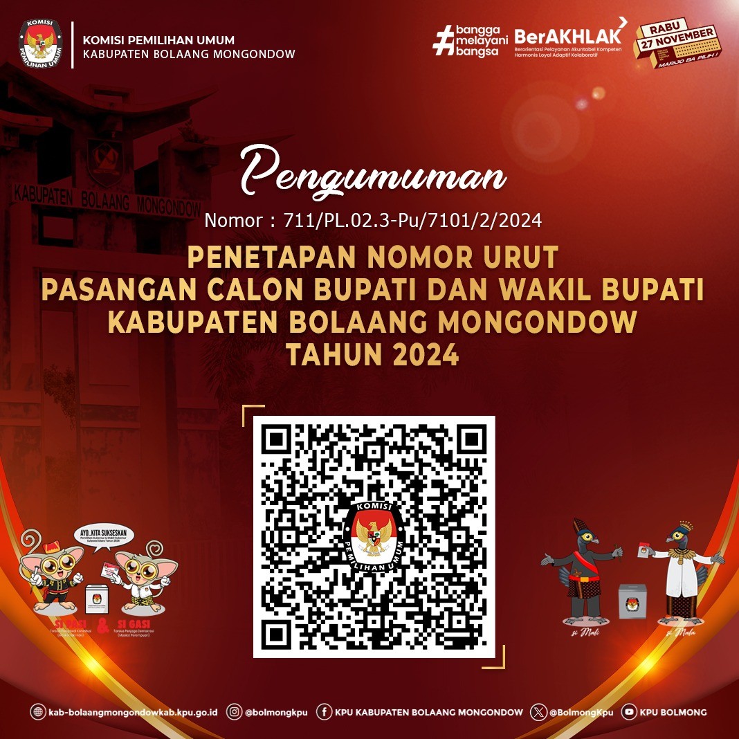 Berikut disampaikan Pengumuman Penetapan Nomor Urut Pasangan Calon Peserta Pemilihan Bupati Dan Wakil Bupati Kabupaten Bolaang Mongondow Tahun 2024