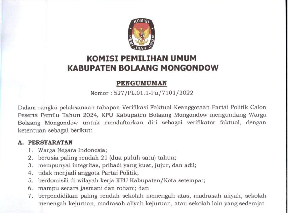 PENGUMUMAN PEREKRUTAN VERIFIKATOR FAKTUAL DALAM PELAKSANAAN VERIFIKASI FAKTUAL PERBAIKAN KEANGGOTAAN PARTAAI POLITIK CALON PESERTA PEMILU TAHUN 2024