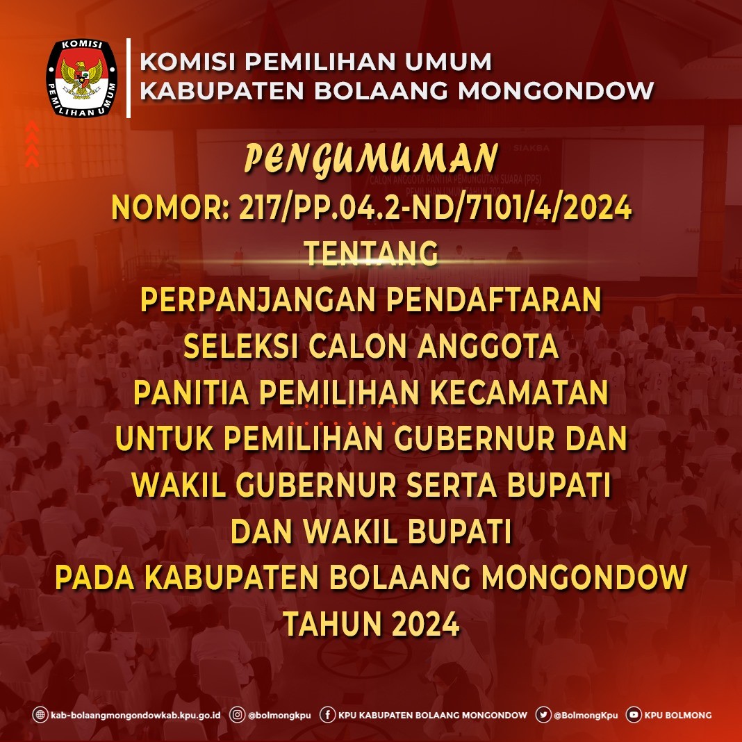PENGUMUMAN PERPANJANGAN PENDAFTARAN SELEKSI CALON ANGGOTA PPK UNTUK PEMILIHAN GUBERNUR DAN WAKIL GUBERNUR SERTA BUPATI DAN WAKIL BUPATI BOLAANG MONGONDOW TAHUN 2024