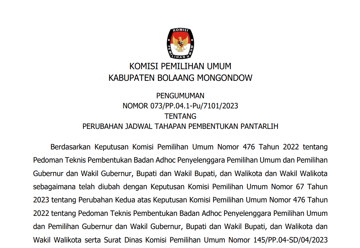 PENGUMUMAN PERUBAHAN JADWAL TAHAPAN PEMBENTUKAN PANTARLIH Minggu, 05 Februari 2023 09:00 90 PENGUMUMAN SELENGKAPNYA {KLIK DISINI} Bagikan: Dilihat 90 Kali.