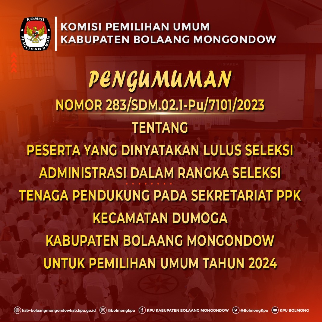 PENGUMUMAN PESERTA YANG DINYATAKAN LULUS SELEKSI ADMINISTRASI DALAM RANGKA SELEKSI TENAGA PENDUKUNG PADA SEKRETARIAT PPK KEC. DUMOGA UNTUK PEMILU 2024