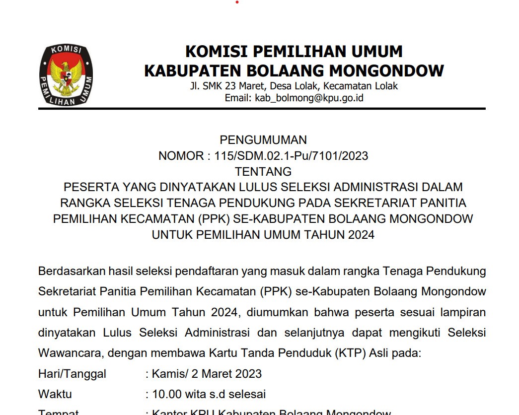 PENGUMUMAN PESERTA YANG DINYATAKAN LULUS SELEKSI ADMINISTRASI SELEKSI TENAGA PENDUKUNG PADA SEKRETARIAT PPK SE-KABUPATEN BOLAANG MONGONDOW UNTUK PEMILIHAN UMUM TAHUN 2024